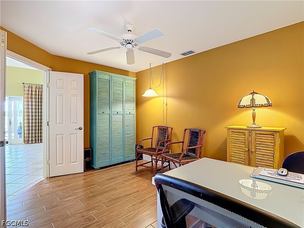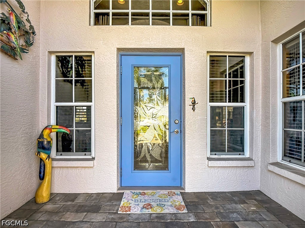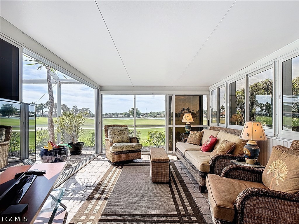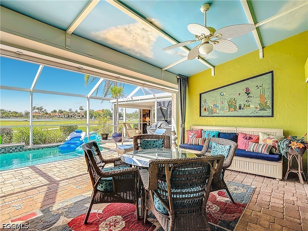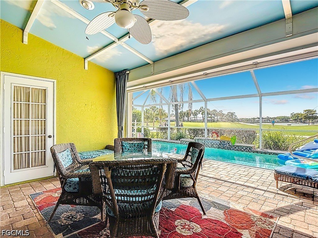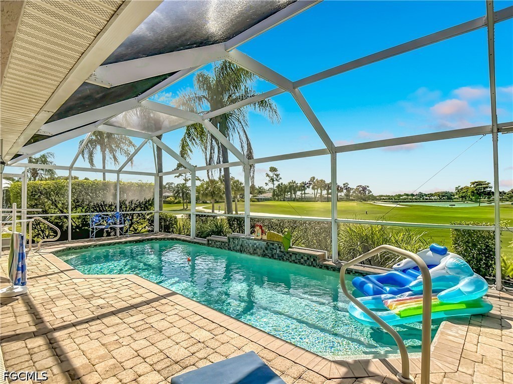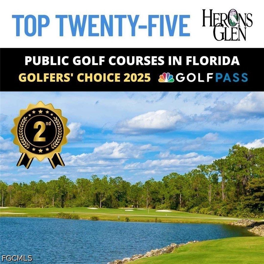 This beautifully customized Custom Ibiza POOL home in HERONS GLEN GOLF AND COUNTRY CLUB sits on one of the MOST COVETED LOTS in the community, with sweeping views of the golf course, large lake, the clubhouse, and the driving range right from your own back lanai. From the moment you arrive, the paver driveway and screened front entry with art glass in the front door set the tone for the quality you will find throughout. Step inside to find IMPACT GLASS sliding doors in the living room that disappear behind the wall and a FIREPLACE that makes the space feel warm and inviting. The home has hard flooring throughout with no carpeting, and tile in the main living areas. The spacious dining room sits just off the kitchen and features a built-in electric fireplace, adding ambiance to everyday meals or entertaining. FRENCH DOORS from the dining room lead to the FLORIDA ROOM, where two walls of glass sliders open fully to the LANAI creating a seamless flow between indoor and outdoor living. The covered and caged lanai with newer SUPER SCREEN features a POOL with jets, a waterfall feature, and a 2024 pump. The kitchen is a joy to cook in, with GRANITE countertops, a double sink, a breakfast bar, extra cabinetry drawers, and stainless appliances including a DOUBLE DOOR OVEN. The enclosed DEN offers double doors and tile plank flooring, making it an ideal home office or flexible living space. The primary bedroom has a door directly to the lanai, and the fully renovated en suite bath is a true retreat, featuring a large sunny walk-in shower with a RAIN SHOWER head, beautiful tile, a FRAMELESS GLASS door, and a granite vanity with rectangular sinks. The guest bedroom is bright and comfortable, and the guest bath also features granite countertops and a rectangular sink. The separate laundry room includes a utility sink for added practicality. The home is well-equipped for Florida weather with a combination of electric and accordion hurricane shutters. Additional updates include a 2021 air conditioning system, a newer garage door, and a 2023 washer. The home is being sold FURNISHED, making this a true move-in opportunity. Living in Herons Glen means enjoying a vibrant, active lifestyle in a gated community with tennis, pickleball, bocce, a fitness center, a resort-style pool, dining, and so much more. The championship golf course was recently ranked the second best in Florida by Golf Advisor, a well-deserved honor for a course that residents get to enjoy year-round. With this home, this view, and this community, Southwest Florida living doesn't get much better than this.