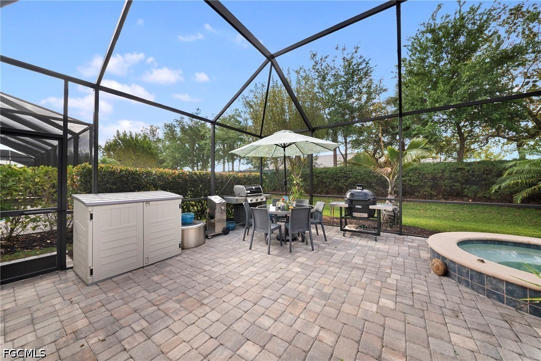 Step outside to your own tropical oasis...a screened in lanai with a covered lounging area, saltwater pool, and spa, all surrounded by lush landscaping. The pool system has been recently upgraded to saltwater with a larger pump, enhancing both efficiency and enjoyment.