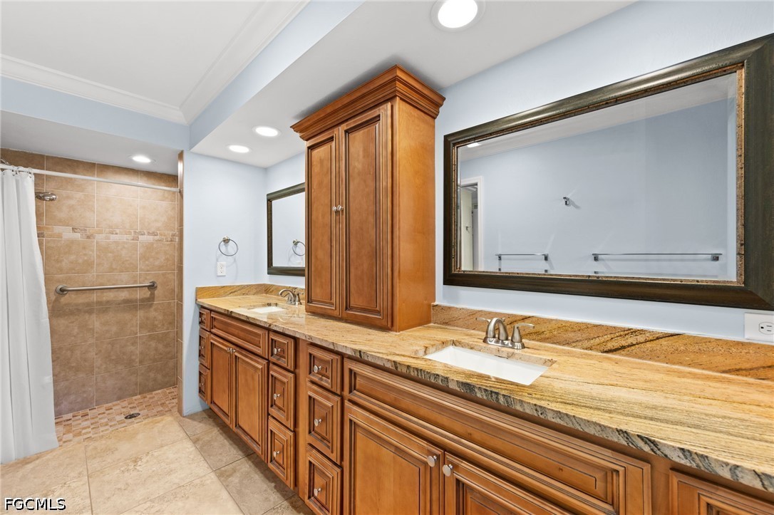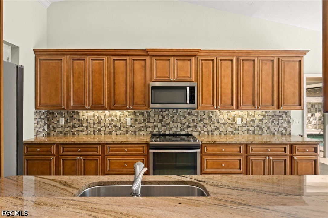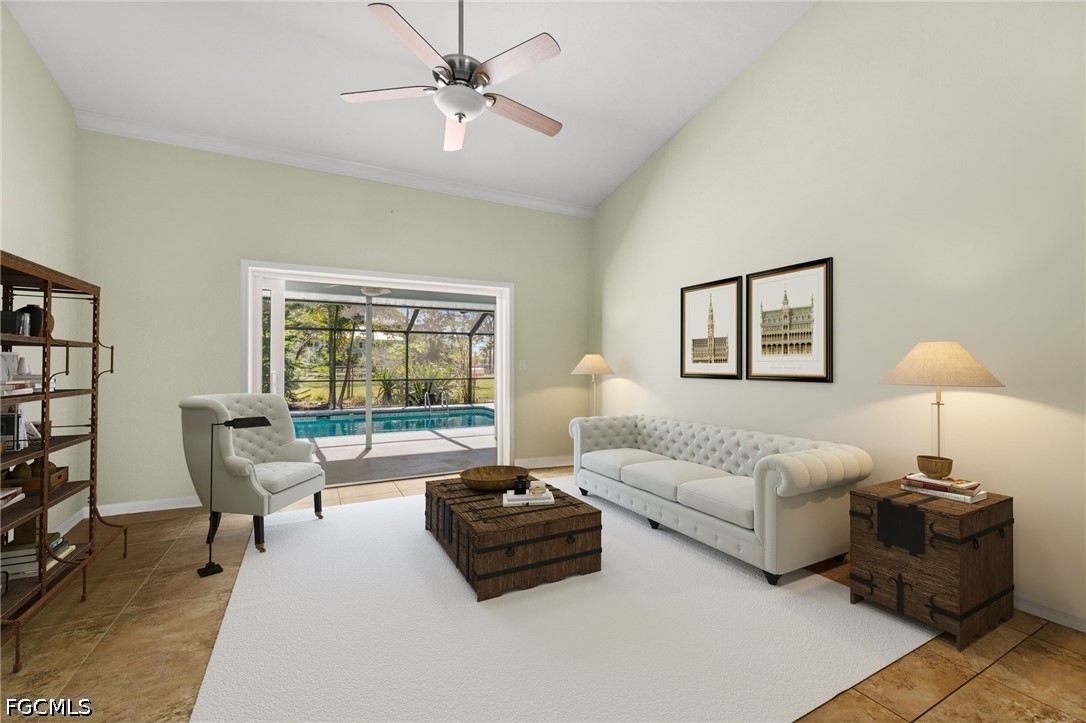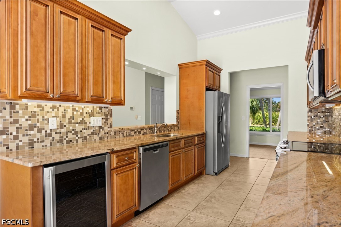 Step through dramatic French doors into a 3-bed, 2-bath, 2,130 sq ft block home with travertine marble floors, vaulted ceilings, and crown molding throughout. The kitchen was built to impress — maple cabinetry with LED accent lighting, Kalahari Desert granite countertops, premium stainless steel appliances, and a 54-bottle wine cooler. Impact windows and impact multi-panel sliding glass doors provide both storm protection and seamless flow to the outdoor living space.