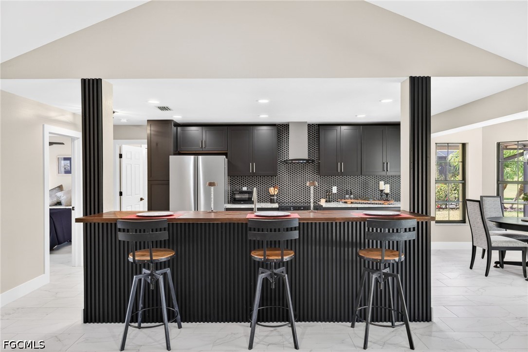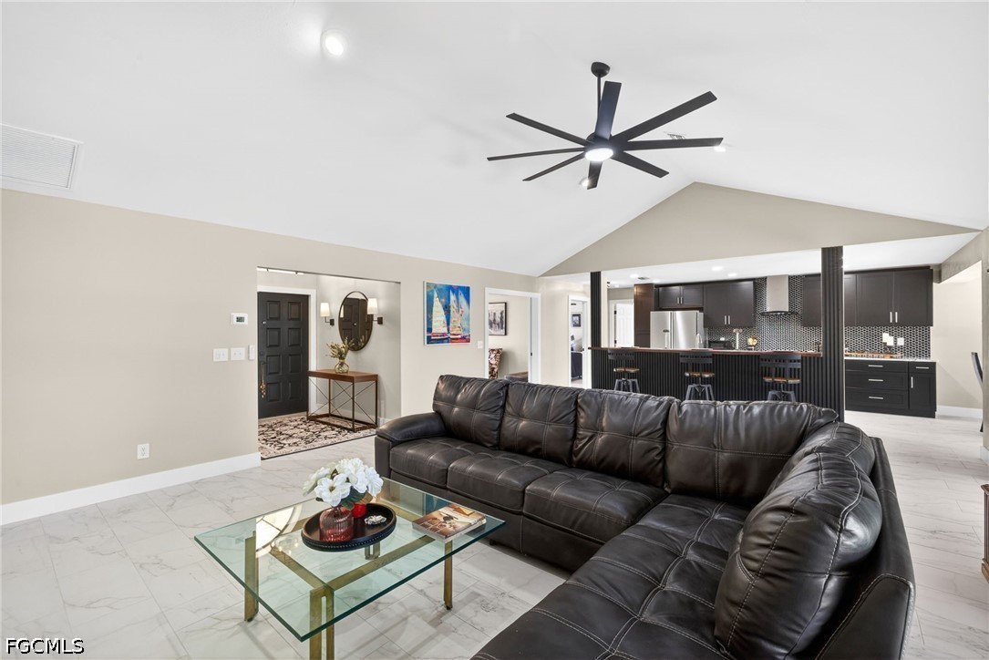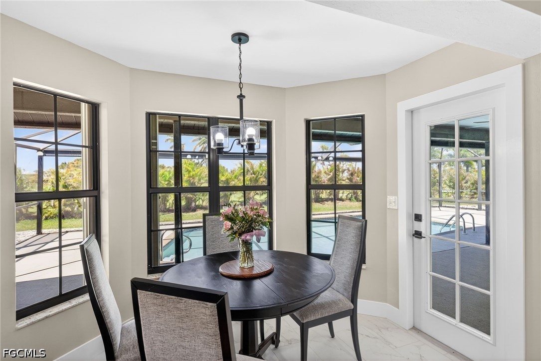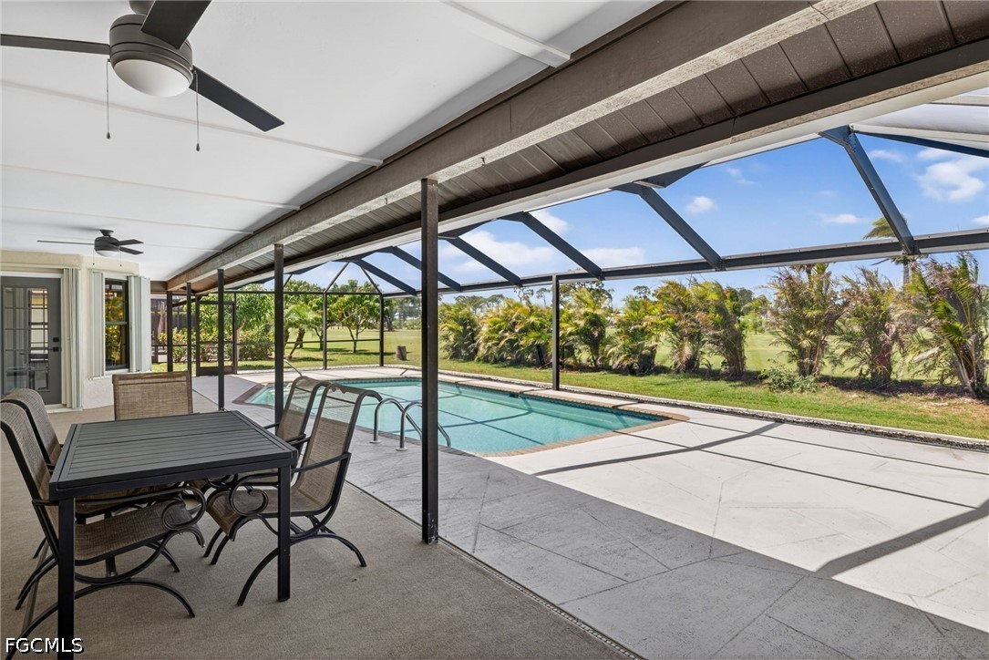 Beautifully remodeled pool home in (2025–2026) overlooking the 13th hole of Palmetto-Pine Country Club, a semi-private Arthur Hills–designed 18-hole championship course offering year-round public golf, affordable memberships, and full dining and social amenities. This elevated property sits outside FEMA’s special flood zone (Zone X), providing peace of mind with no flooding and typically no flood insurance required by lenders. A huge oversized open-floor-plan living area flows seamlessly to the outdoors through three sets of large glass sliders that pocket fully into the wall, maximizing natural light and panoramic pool and golf views. Step outside to your private oversized built-in pool, framed by premium picture-window screens and complemented by an expansive under-lanai area and full-length sun deck—perfect for year-round Florida living. Inside, the home offers 1692 sq ft of living area, 3 bedrooms and 2 baths including a convenient remodeled pool bath, plus full hurricane protection with a mix of Hurricane bifold shutters and some newer impact window replacements. The new contemporary remodeled kitchen features beautiful fine cabinetry, extensive heavy drawer storage, top-of-the-line appliances, a state of the art slide-in range, stone backsplash, a long island bar for entertaining, and gorgeous stone counters and rustic block bar top. Fresh paint, no carpet, 12x24 modern tile throughout, high cathedral ceilings, recessed lighting, designer fans, and a bright double-door front entry with transom window elevate the home’s clean, modern feel. The rear dining area overlooks the pool and golf course for picture-perfect views. Additional highlights include a newer 3-year-old roof, 1 1/2 year old A/C System with 10 Yr warranty, 6 mo old Hot Water tank with warranty, Brand New Pool Pump with warranty, a 2-car garage, PLUS NO HOA, and near club’s low membership amenities—full-service dining, bar, social events, bocce, locker rooms, and Mulligans outdoor snack bar. A rare opportunity to enjoy resort-style living in a beautifully updated home with exceptional outdoor space and year-round golf just steps away. Please view the 3 D ZILLOW tour linked with Floor Plan. See flyer attached showing public and very affordable memberships. This beautiful golf course frontage pool homes in this prime SW Cape Coral area, conveniently located to virtually everything, are a rare find at this price.