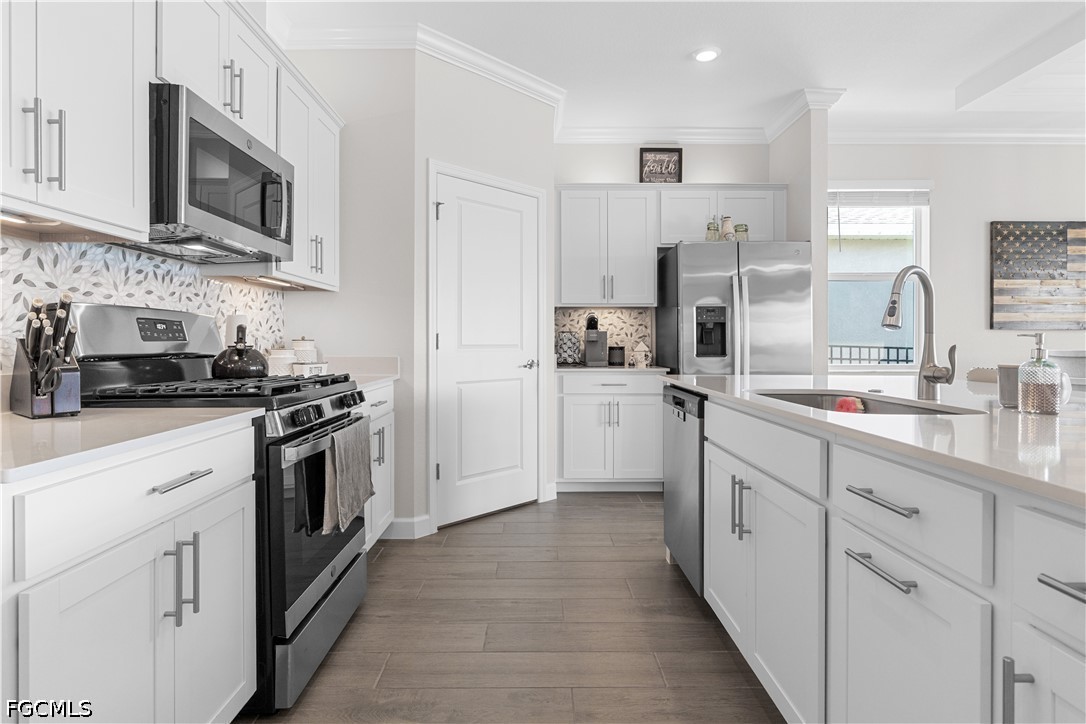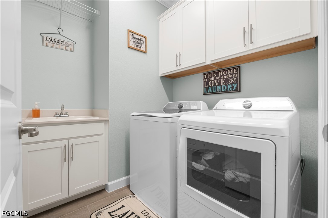 Epoxy-coated garage floors with custom wood built-ins, Laundry room with cabinetry, crown molding, and sink