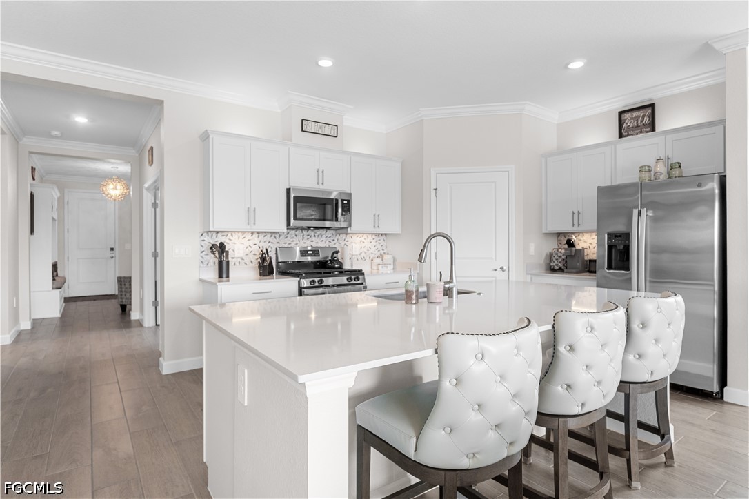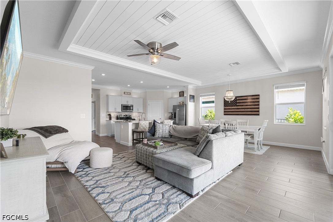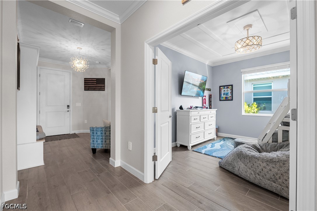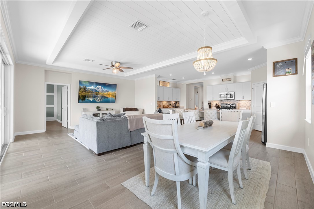 Step inside this beautiful home and immediately notice the attention to detail—features NO CARPET ANYWHERE, with stunning wood plank tile flooring throughout. The elegant foyer welcomes you with tall built-in-hutch & crown moulding, setting the tone for the custom craftsmanship found throughout the home. From the beautifully framed windows and sliders to the shiplap tray ceiling with crown molding accents, every space has been thoughtfully designed.