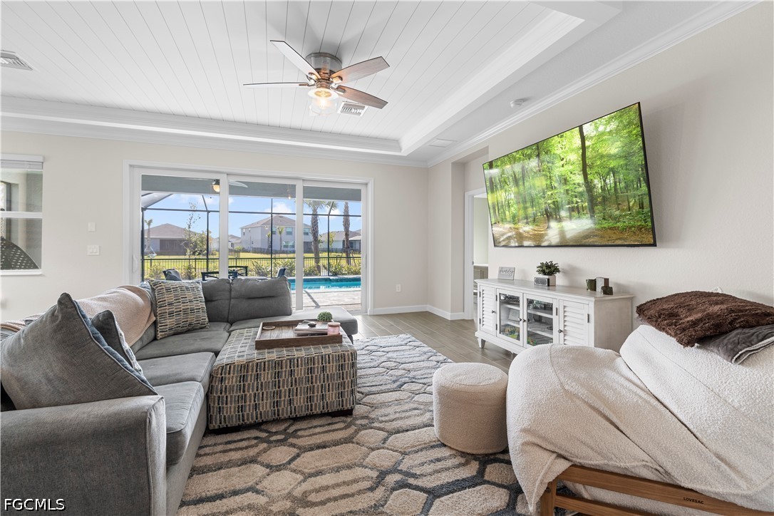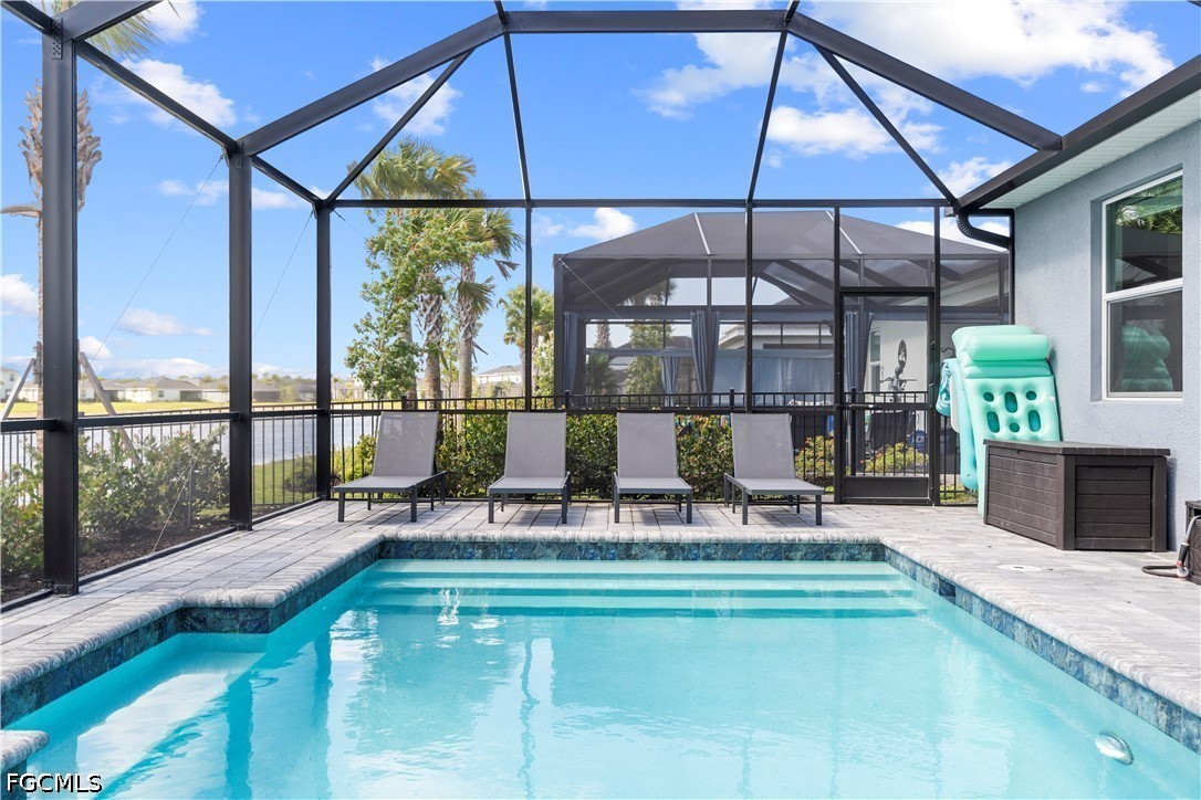 The heart of the home is the gourmet kitchen, showcasing quartz countertops, a large island with an oversized sink facing the pool and lake, and a striking backsplash. Walk in large pantry, gas stove and USB charging ports in the plugs. Enjoy above and below cabinet lighting with customizable colors, creating the perfect ambiance for any occasion. Three expansive 3 sliding glass doors flood the space with natural light & connect indoor and outdoor living.