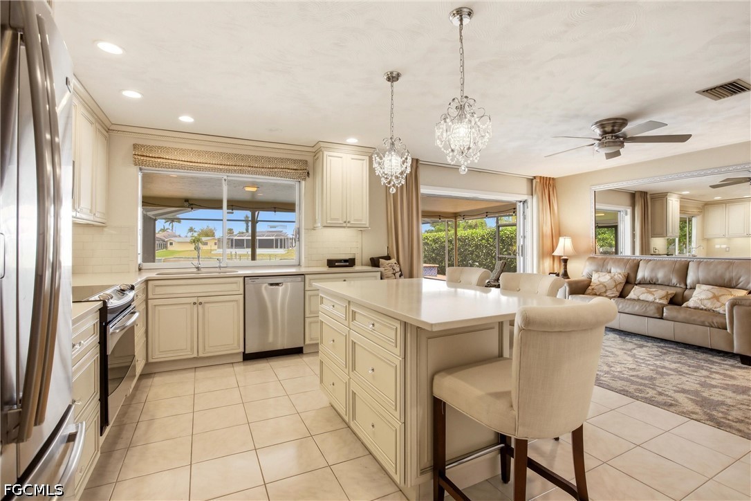 Amazing Views from this 1,962 Sq Ft Gulf Access Pool Home on Intersecting Canals! Truly only 11 Minutes straight shot out to the River with 1 bridge (11.3 Foot High) and home is NOT in a Flood zone with All Assessments Paid! Home is being sold TURNKEY fully furnished so all you need is your toothbrush, although I recommend a couple of clean pairs of underwear as well! Updates include New Metal Roof and A/C in 2023, Gourmet Kitchen with Custom Island, Pantry, Stainless Appliances, Updated Baths with Double Vanity! Split Bedroom 3 Bed 2 Bath Floor Plan with oversized 2.5 car garage with plenty of room for storage, extra wide Paver Driveway, screened entry porch area. Outside Features 146 Ft Deep Lot with 80 Ft of Water Frontage, landscaping which includes 2 Avocado Trees and 10 Palms, Screened Lanai, with newer Heated Pool and Hot Tub with LED Multi Colored Light all help make this the ideal home!
