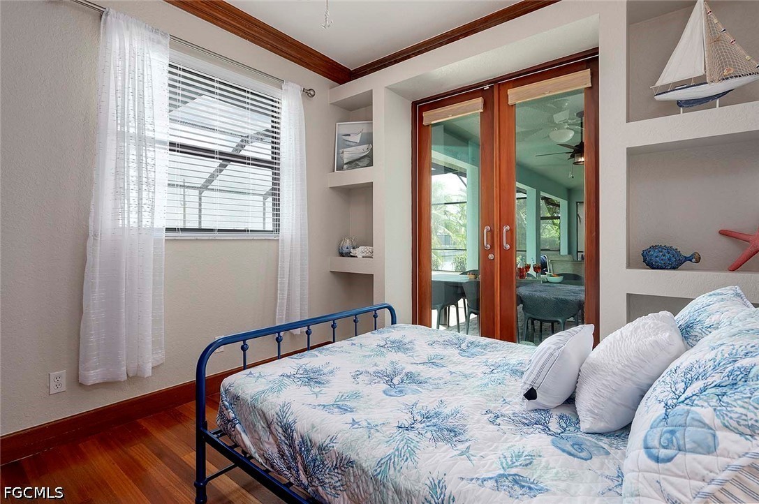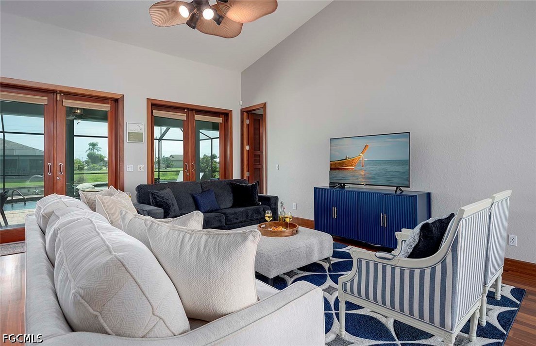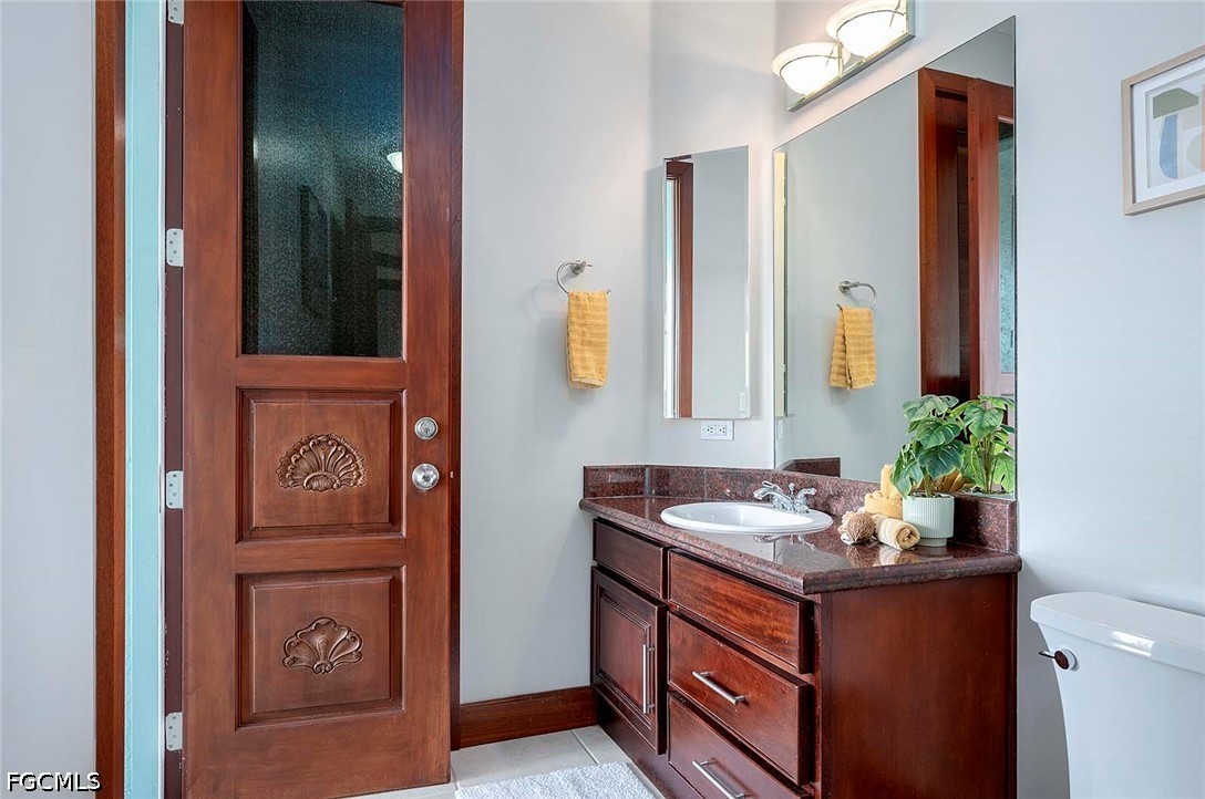 Interior features include solid mahogany flooring, 6-inch baseboards and trim, elegant crown molding, and impressive 9-foot custom doors imported from Asia and hand-carved on site. The spacious open floor plan is perfect for both everyday living and entertaining, with a large kitchen featuring an island, a formal dining area, and a generous living room overlooking the lanai, pool, and canal. The guest bathroom conveniently doubles as a pool bath.