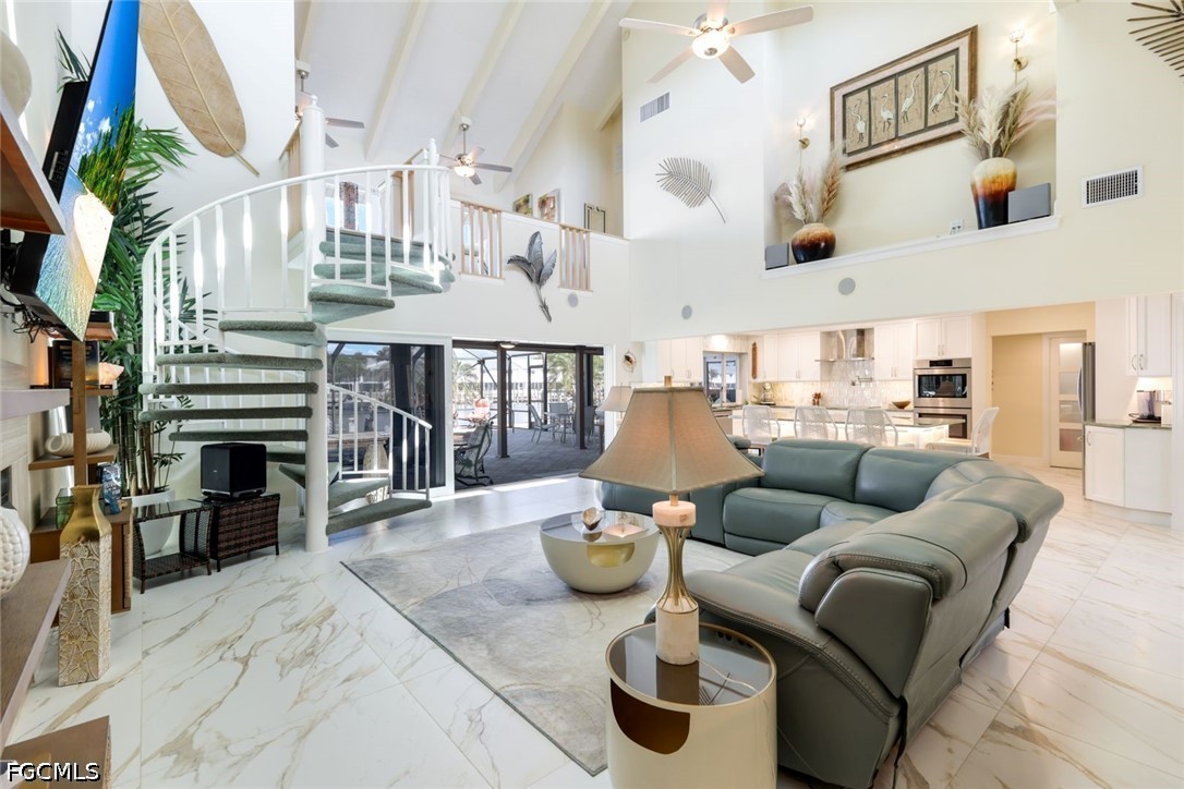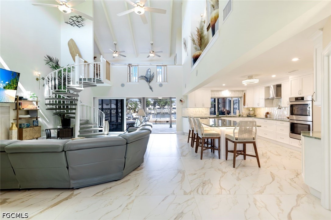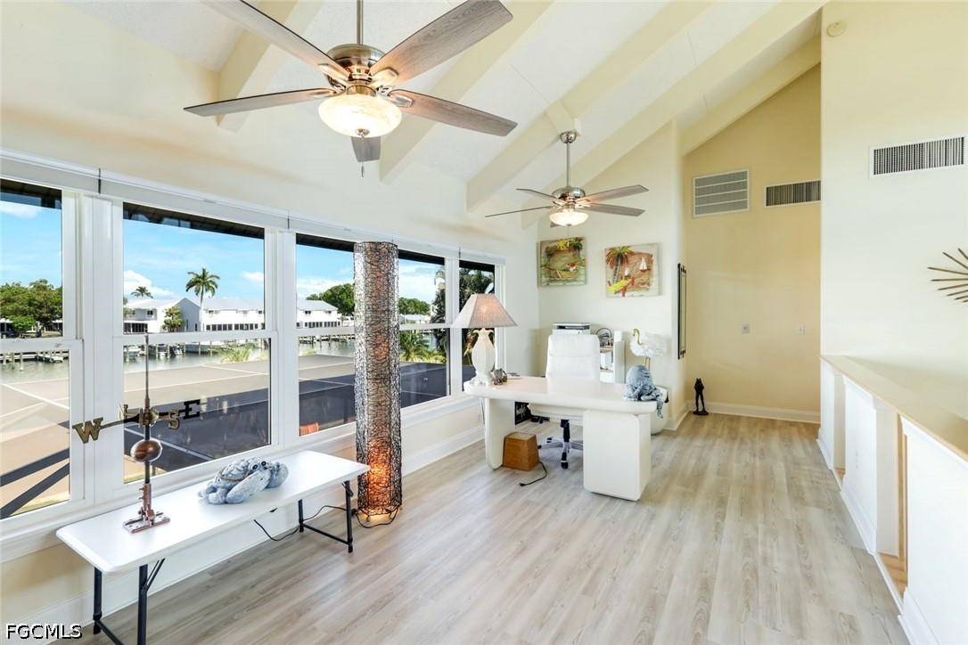 Back inside, the spiral staircase leads to a loft with a Murphy bed adding flexible sleeping or workspace options with windows overlooking the water. The oversized primary suite provides a private retreat with a sitting area. The primary bath offers a large walk in shower, a jetted tub, double vanities and double sinks. The impact French doors from primary suite lead to an upper deck and cat walk with Brazilian wood railing. Enjoy the sunrise from the back deck and sunsets from the front deck.