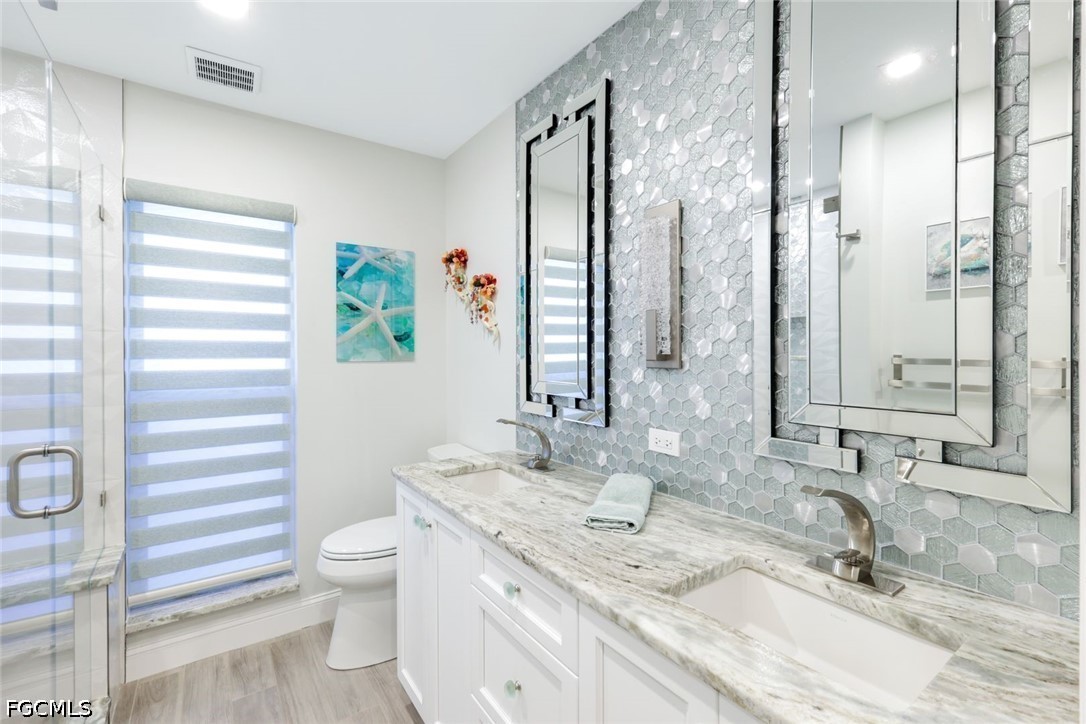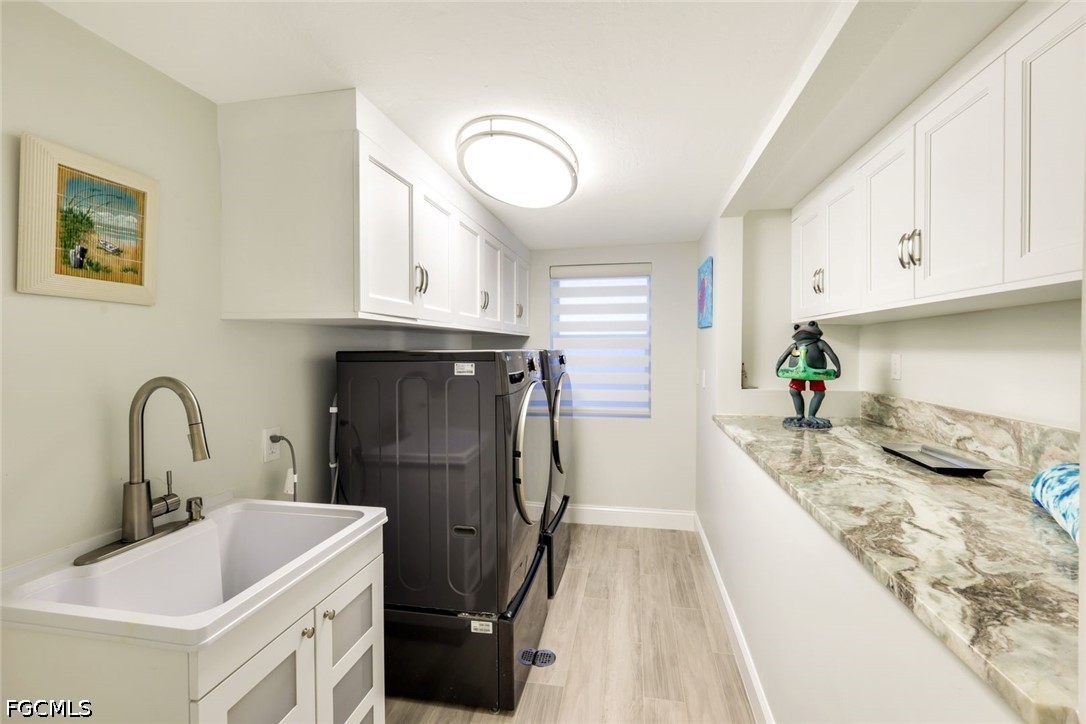 A flex room is off the living area. The first floor also offers a large bedroom, a bathroom with double vanity with leather granite and walk in shower. A large laundry room with cabinets, granite countertops and utility sink.