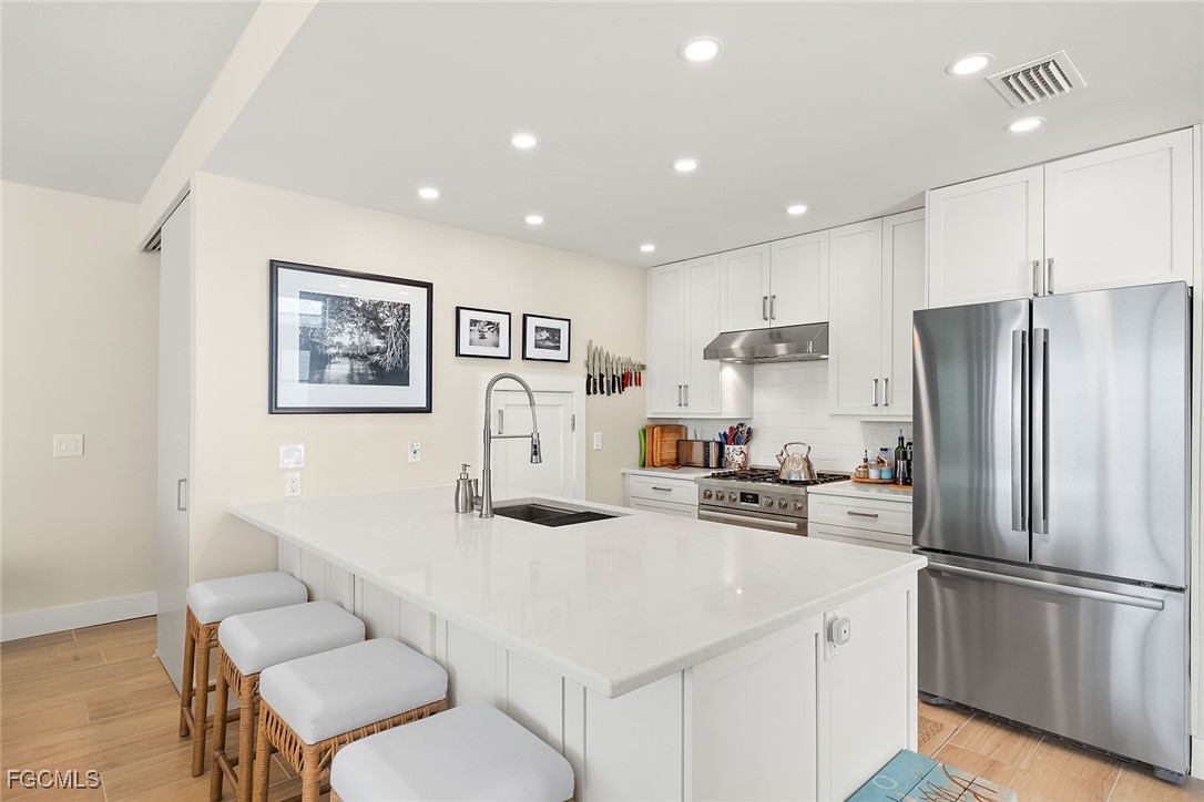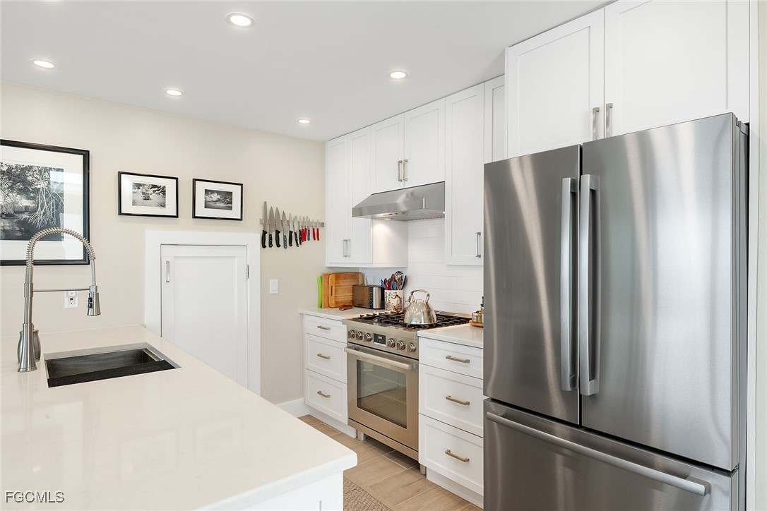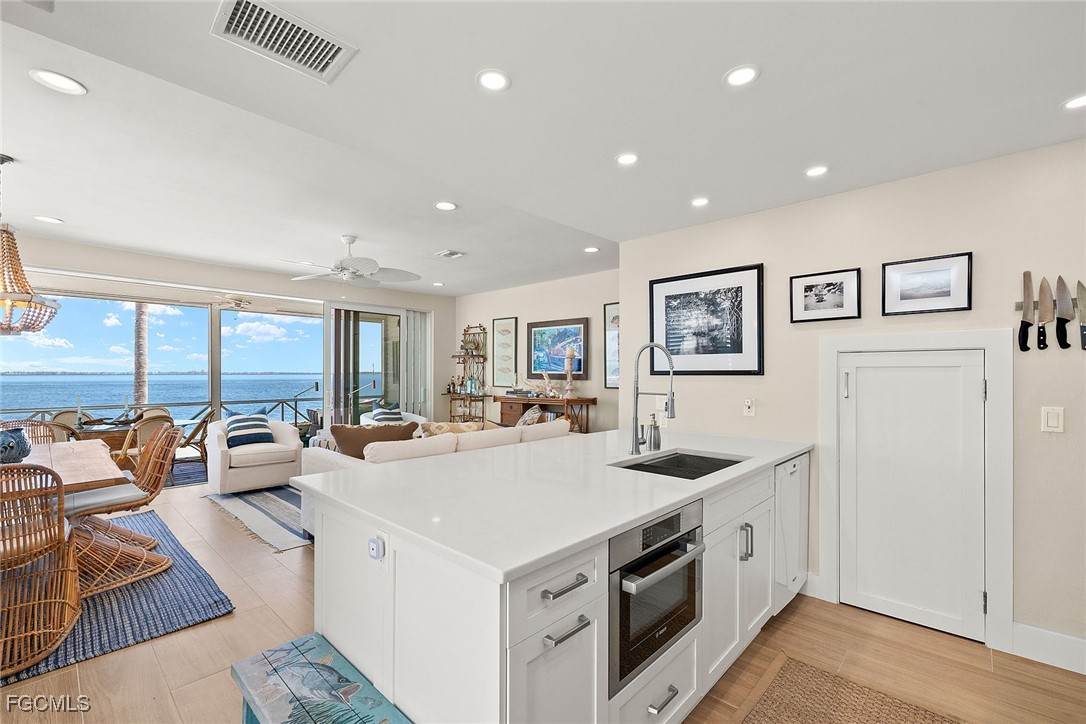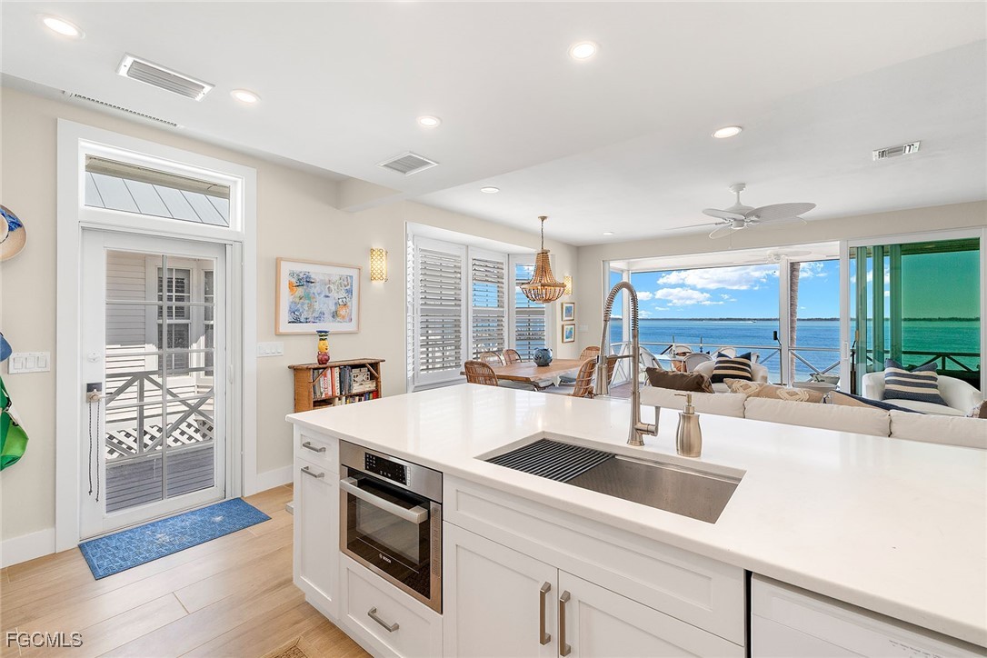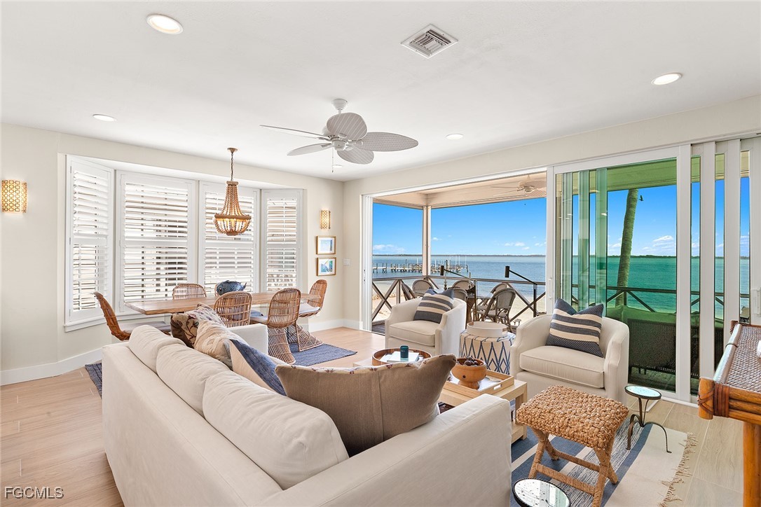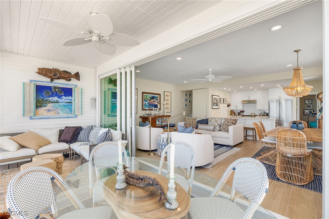 114 North Useppa Island is a rare and distinguished island beach property that offers a luxurious and functional family waterfront/beach lifestyle while providing its new owners seamlessly never ending breath breathtaking views of Pine Island Sound and the historic Cuban rancheros stilt houses. In the summer of 2020, the home went through extensive renovation. New Bosch kitchen appliances, wide plank ceramic wood-look tile flooring throughout the house, new furniture and refreshed interior painting throughout. In 2022, the home received new storm sliders to open up to the living room, and new slider doors in the main. All windows were resealed to hurricane code and the metal roof refastened with upgraded screws. The exterior of the house is white vinyl siding and has spacious decking with direct access to the beach to the east, and to the west the Useppa Island Club Marina and the historic pink path. The interior boasts a high-grade elevated architectural layout and design utilizing all 1,206 square feet to the upmost potential. The living area features ceramic wood-look tile flooring, custom plantation shutters and solid core doors are found throughout the home. First-floor living features a chef's kitchen with Bosch appliances and gas stove, marble countertop, open living room with a dining area all with stunning open water and beach views. There is a downstairs bedroom with en suite that could serve as a ground floor main bedroom and with western views toward Useppa Marina. Your villa comes with a deeded under 24-foot boat slip in the Useppa Island Club Marina which is conveniently a few hundred feet directly west of the house. Second floor living, the upstairs primary main bedroom suite is spacious and has dual custom sinks, and convenient upstairs laundry room. A private deck of the main bedroom overlooks the expanse of Pine Island Sound.