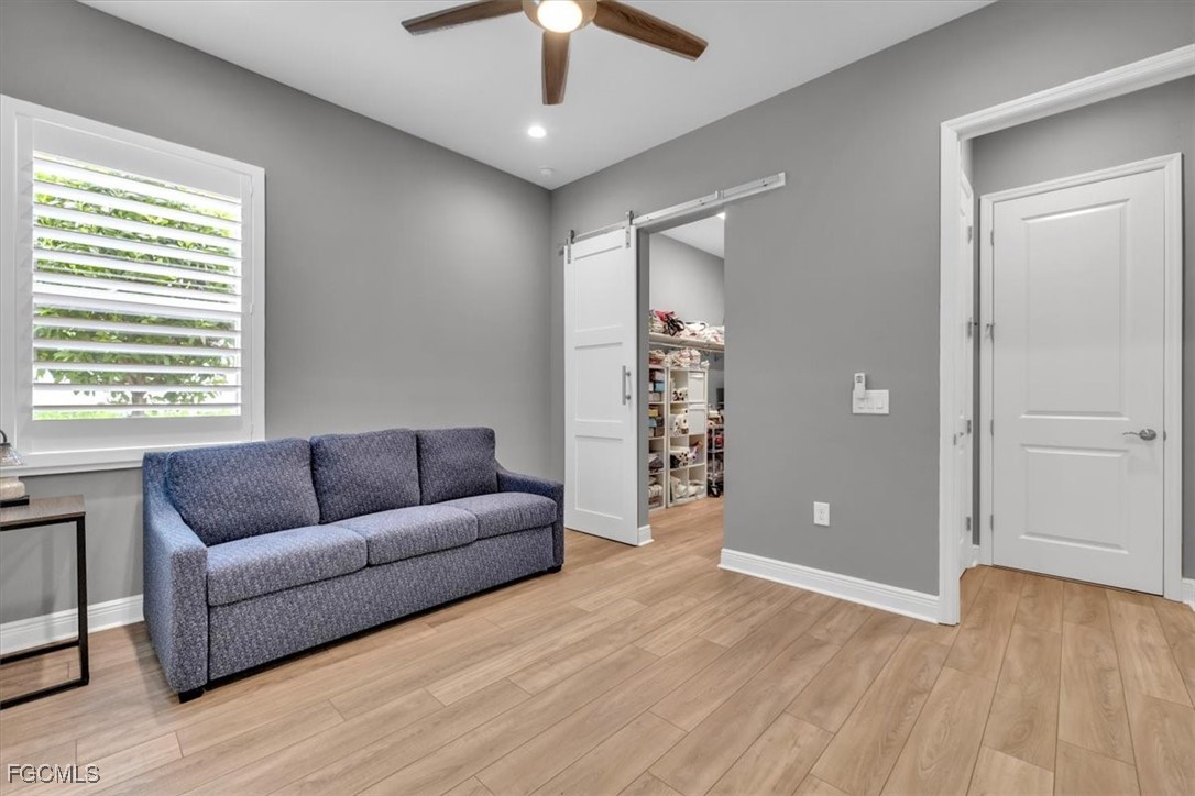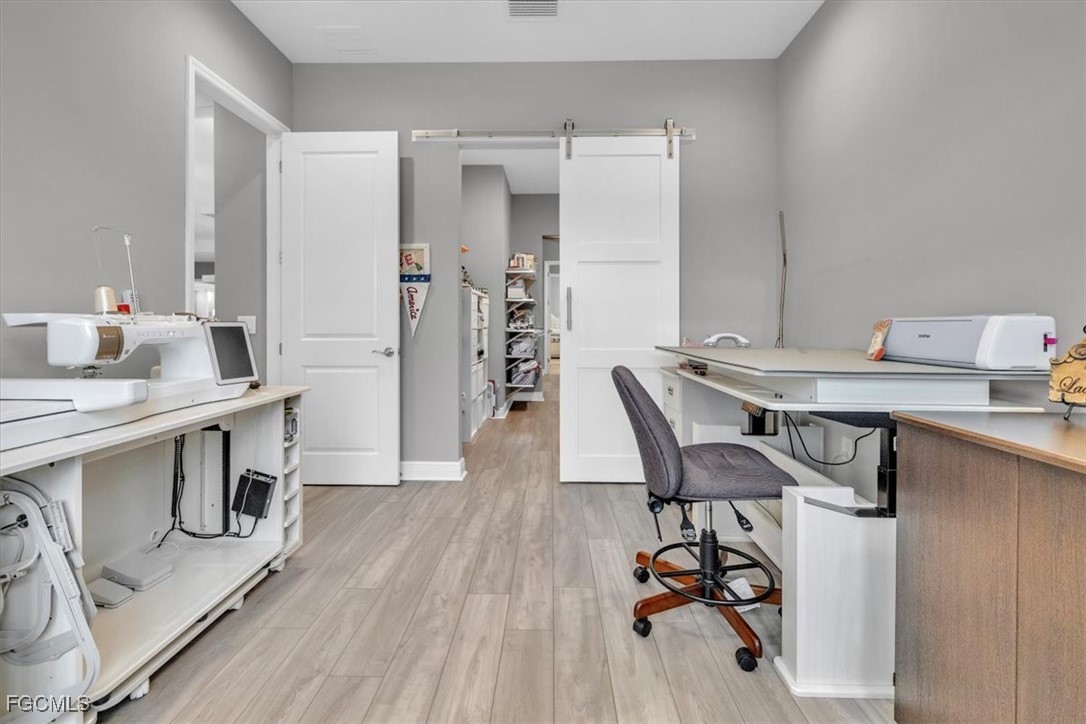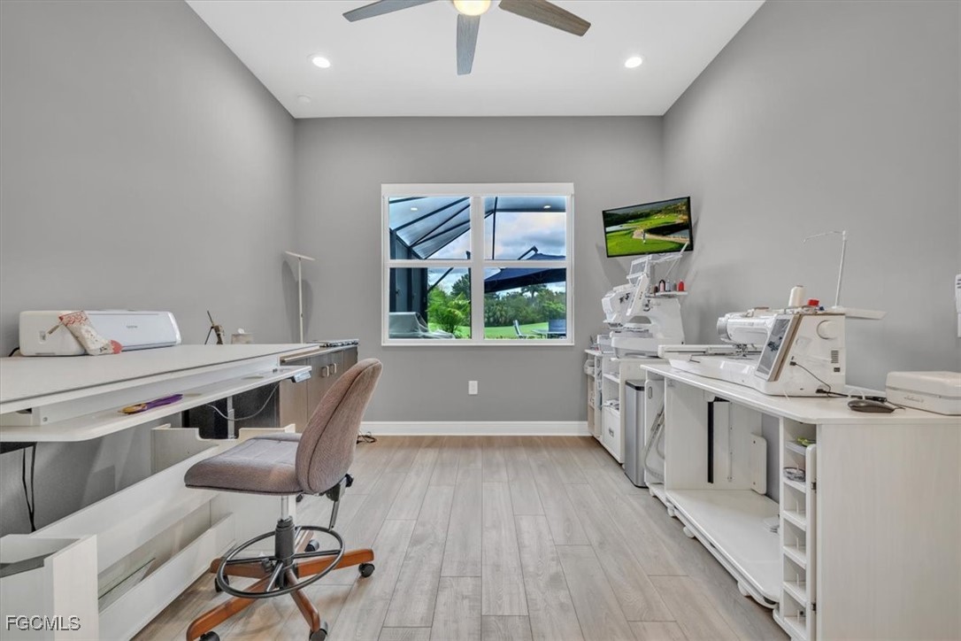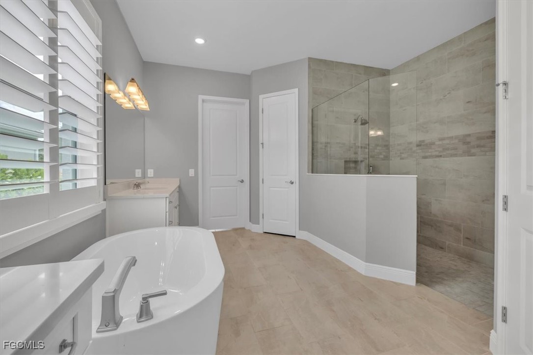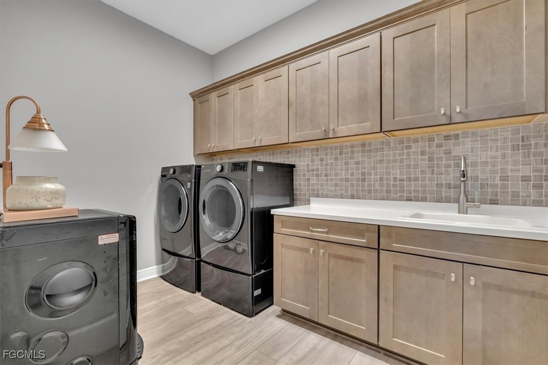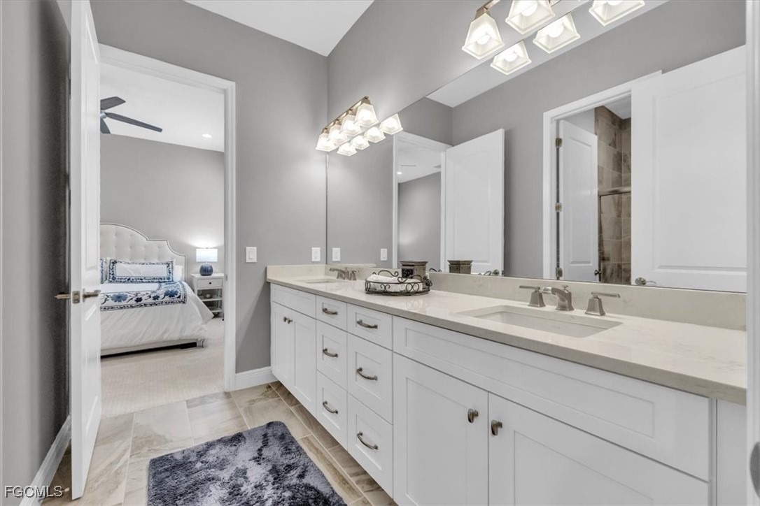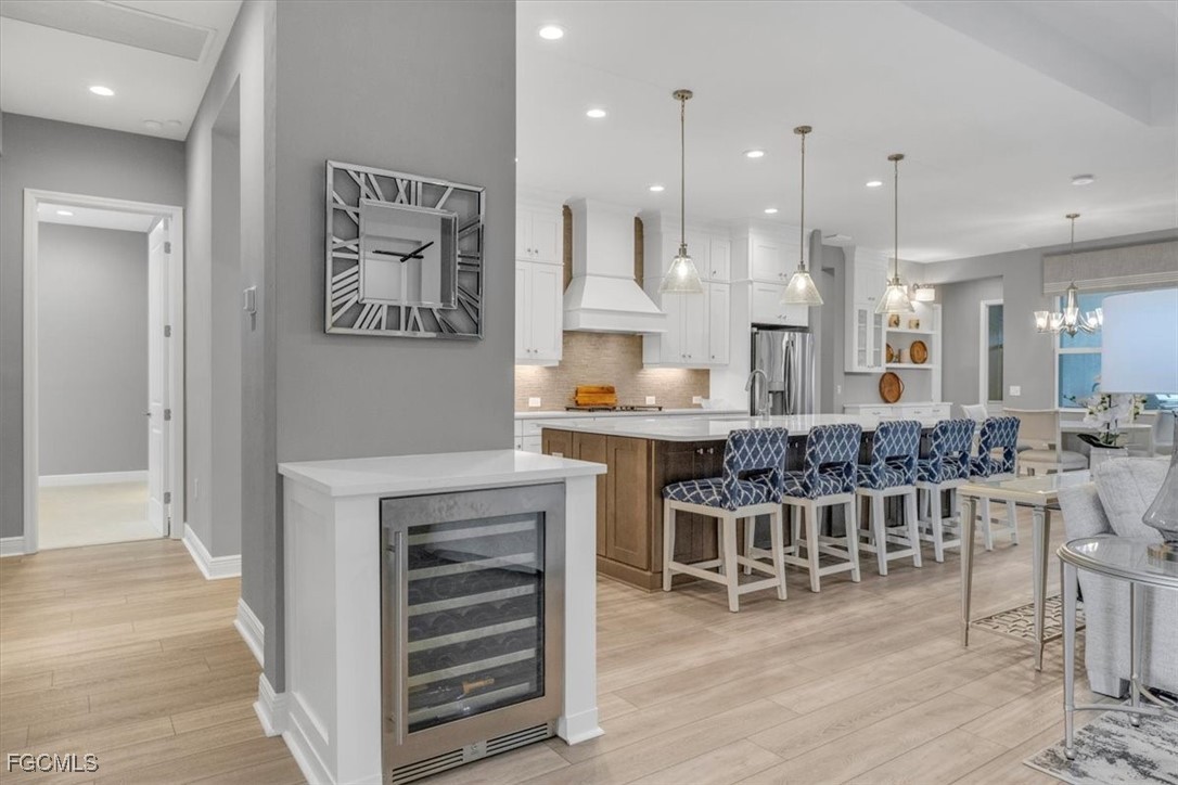 A rare opportunity presents itself to own an exquisite Neal Kiawah model with every upgrade imaginable in the active and beautiful gated community of Verandah. This luxurious 4 Bedroom+Den, 3 bathroom, 3 car garage home features nearly 3000 sq. ft. of living space with contemporary decor and the latest upgrades and colors. Upon entering the home through the large foyer, you will be greeted by an open floor plan with high tray ceilings, tile flooring, wine cooler, enhanced lighting, fan fixtures, and custom window treatments. The gourmet kitchen adjacent to the family room boasts upgraded appliances, quartz countertops, custom cabinetry, a side coffee bar, large island for dining, entertaining or cooking prep, pendant lighting, and a walk-in pantry. The large breakfast nook or dining area offers more cabinet space, upgraded lighting, and easy access to the outdoor area with the spectacular view. The primary bedroom suite is a private oasis with sliding door access to the lanai, plantation shutters, spa-like tub, walk-in shower, and a generous walk-in closet with custom cabinetry. The other 3 bedrooms are spacious and feature plantation shutters, large closets, and carpet & tile flooring. Barn doors separate two bedrooms where the closet space was combined for more storage for use for a sewing, art or other hobby area. The Den features a custom built-in wall unit with accent lighting and glass French doors. The home also features an air-conditioned 3-car garage with new built-in storage, custom closets, and a whole house generator. Plantation shutters and blinds adorn all the IMPACT windows. The outdoor space is like a luxurious resort with a built-in kitchen featuring a custom natural gas grill, mini fridge, garbage disposal and ice machine. The lanai area has multiple TVs, an elegant fireplace, multiple seating areas under roof, and electric storm shutters when needed. The salt water pool/spa overlooks the Golf Course with a northeastern exposure and has many areas for sunbathing. Complement this with an extensive landscape and lighting package and your outdoor space converts into a resort paradise. The Verandah community offer something for everyone and it includes amenities such as 2 Championship Golf Courses designed by Jack Nicklaus and Bob Cupp, tennis facilities, pickleball courts, a state-of-the-art fitness center, bocce courts, kayaks, a dog park, playground, 9 miles of walking and biking paths, multiple restaurants, and an active social calendar throughout the year. This property truly offers the ultimate Florida lifestyle for family and friends. Don't miss out on the opportunity to own this luxurious home in Verandah and find your place in paradise.
