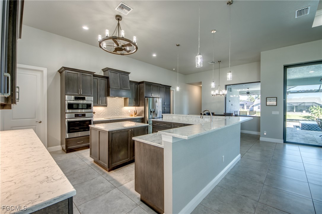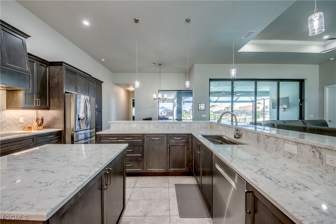 Welcome to this stunning 4 bedroom + den, 3 full bathroom, custom built, waterfront home with a spacious 3-car garage, perfectly situated in the highly sought-after Surfside area of Cape Coral. From the moment you step inside, you’ll be greeted by an open-concept floor plan with elegant 24”x24” tile throughout, designed to combine style, comfort, and functionality.