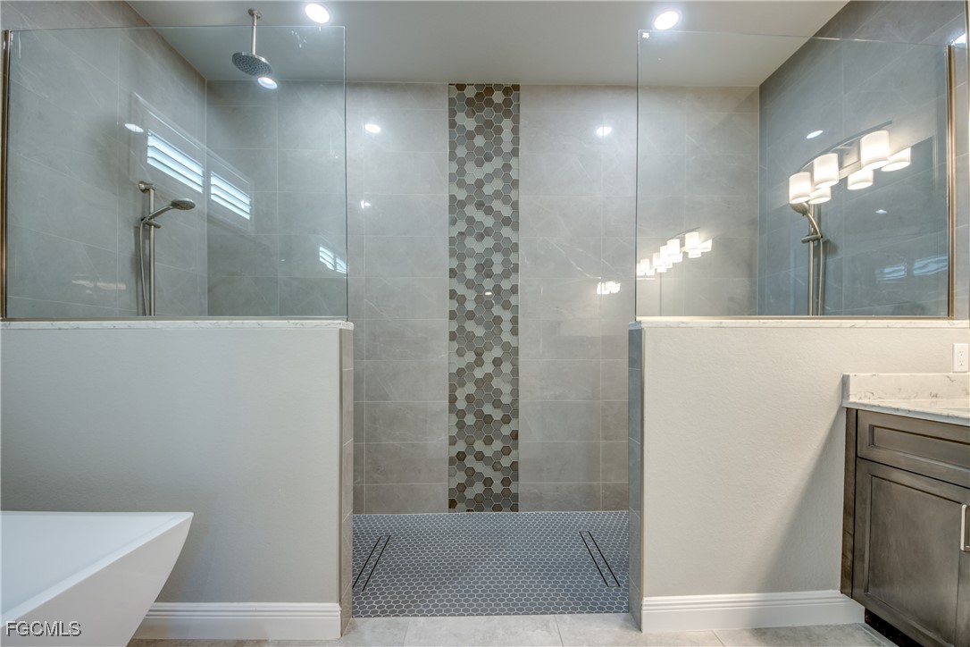 The luxurious primary suite offers direct pool access through french doors, two walk-in closets, and a spa-inspired en suite with dual vanities, a soaking tub, and a walk-in shower.