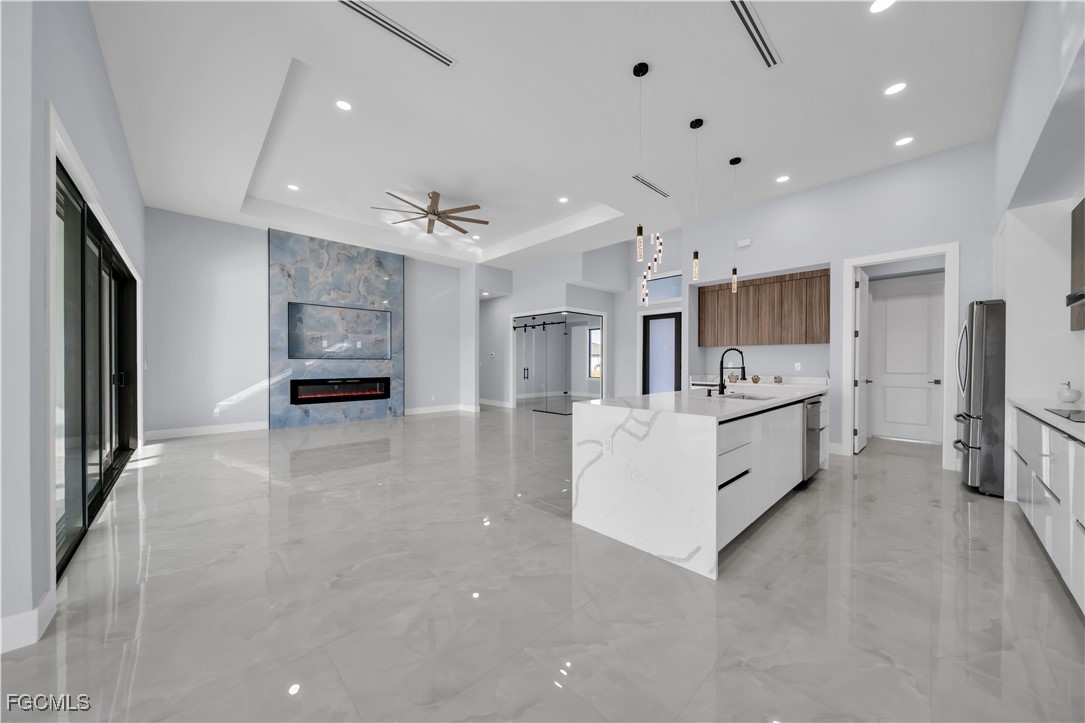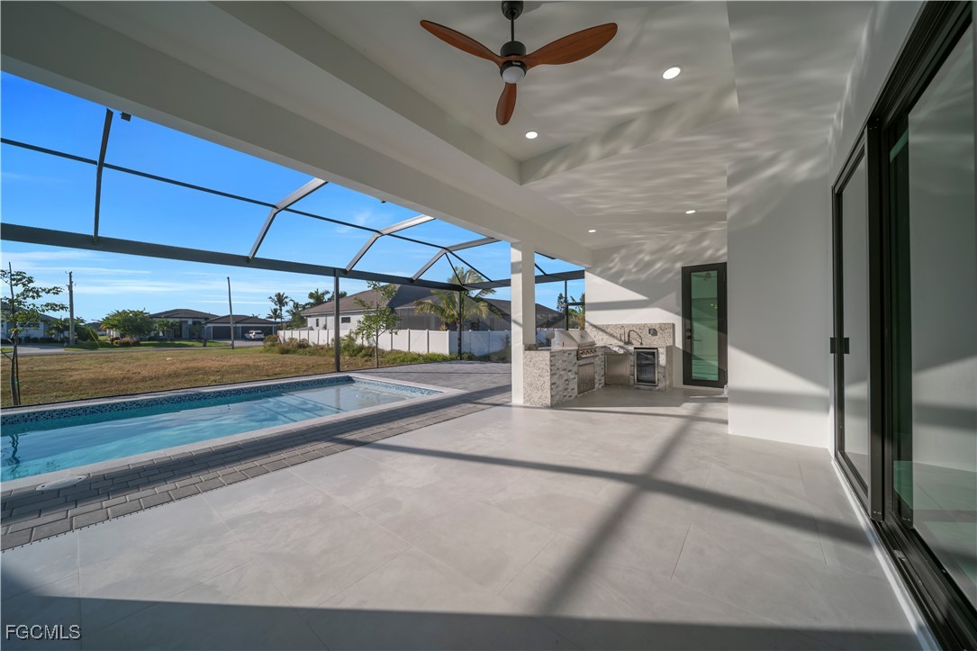 Discover luxury Florida living in this brand-new 2025 custom pool home! Designed for seamless indoor–outdoor living, it features a sunset-facing lanai with summer kitchen and designer shower wall. Inside, enjoy large porcelain tile floors, tray ceilings, and a chef’s kitchen with waterfall quartz island, premium appliances, wine bar, and coffee bar. The primary suite offers a spa-style bath with freestanding tub, walk-through shower, and custom walk-in closet. City water & sewer, assessments fully paid. Built to the 2025 Florida Building Code with impact-rated materials and energy-efficient systems.