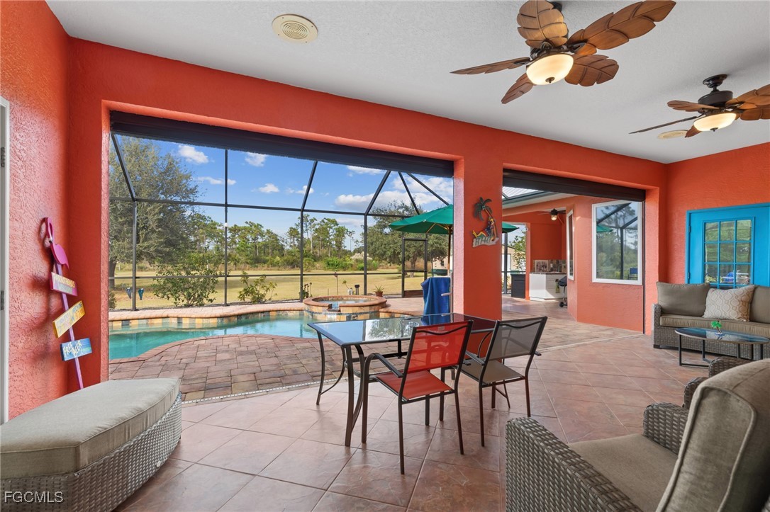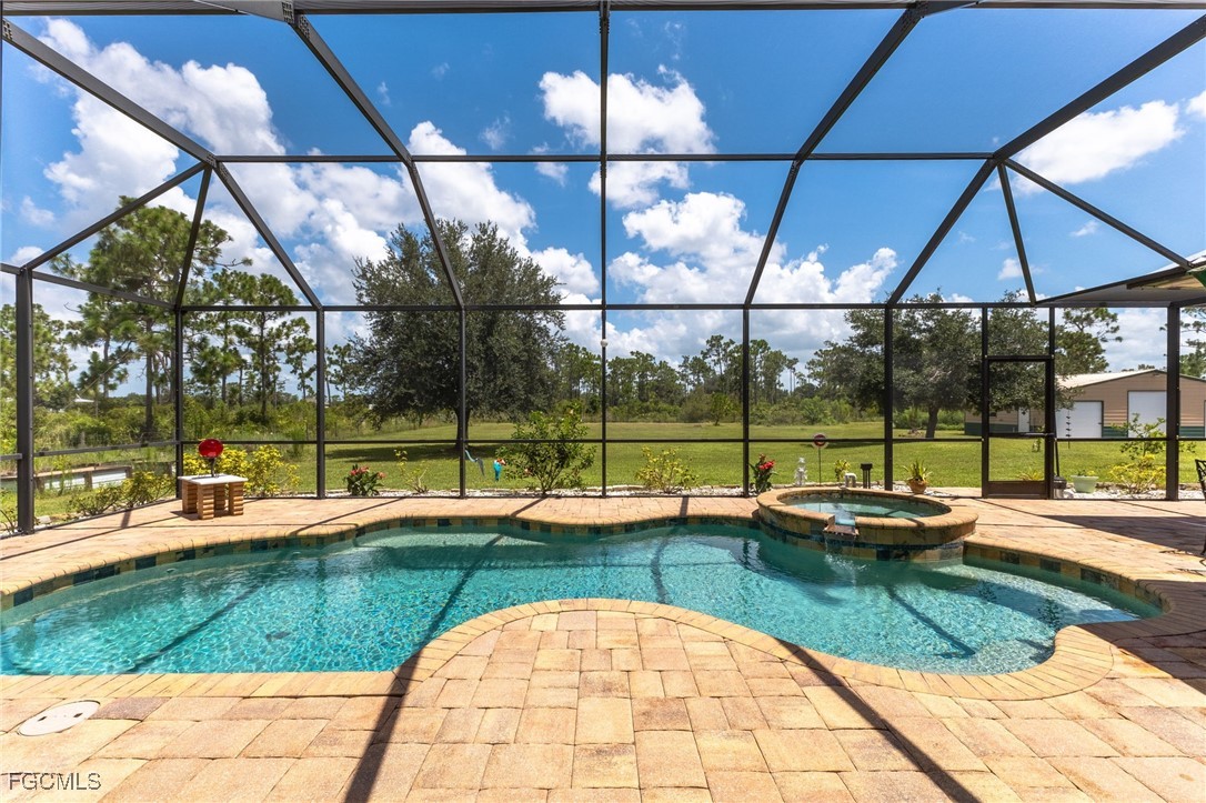 The screened lanai features electric shutters, an outdoor kitchen, and a heated saltwater pool with hot tub—an inviting setup for gatherings or quiet relaxation. The fully fenced and gated property includes an electric wire fence for added security, and a scenic pond enhances the tranquil atmosphere. Horses are welcome, making it ideal for equestrian enthusiasts.