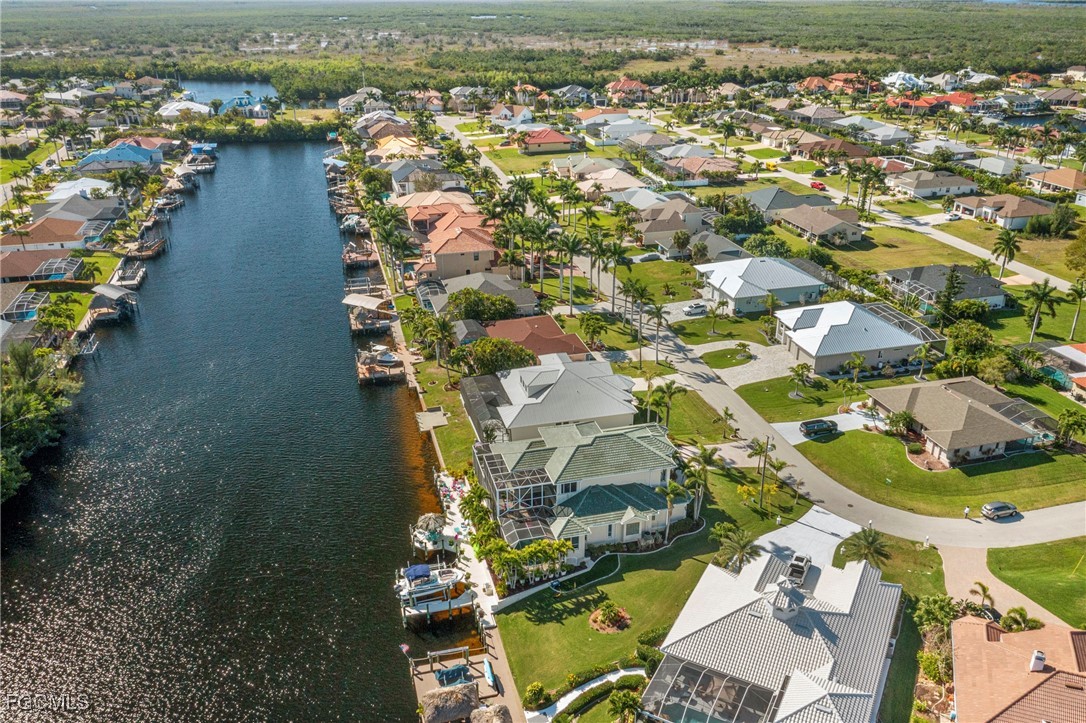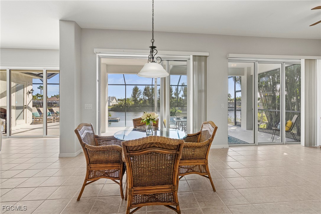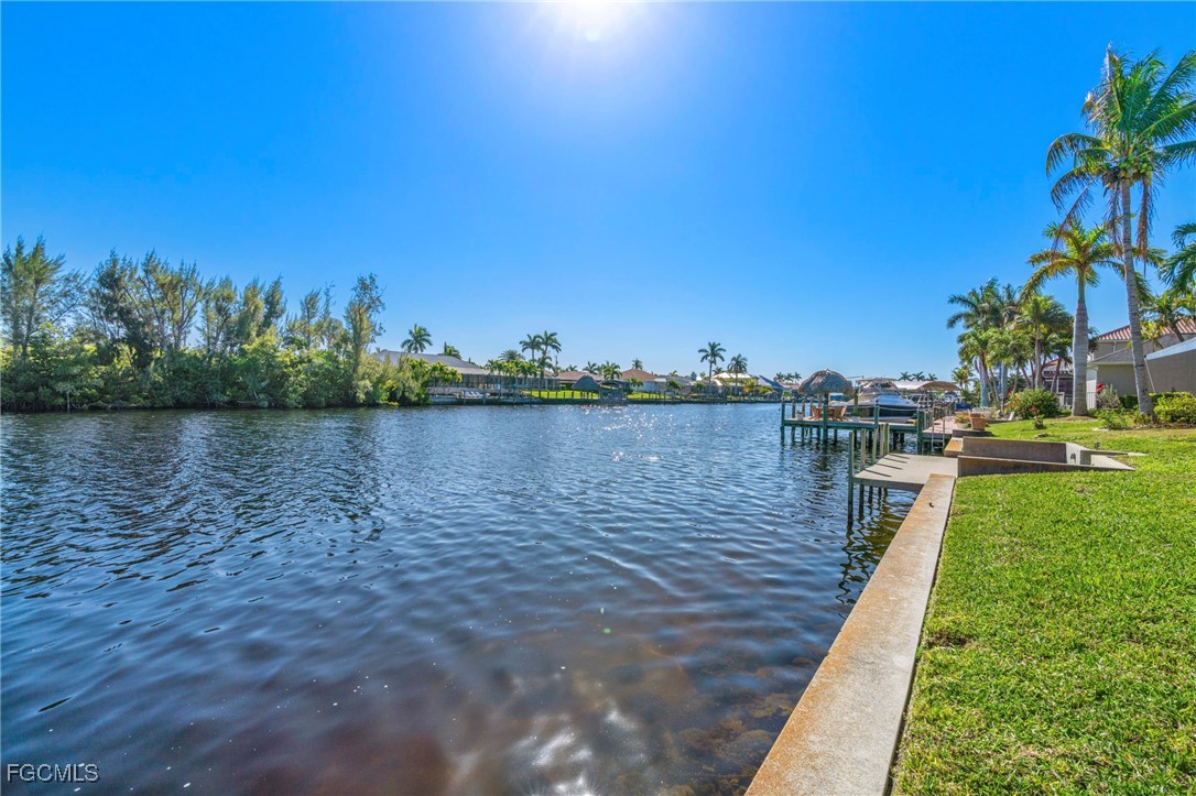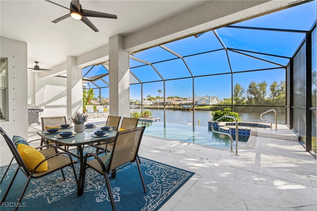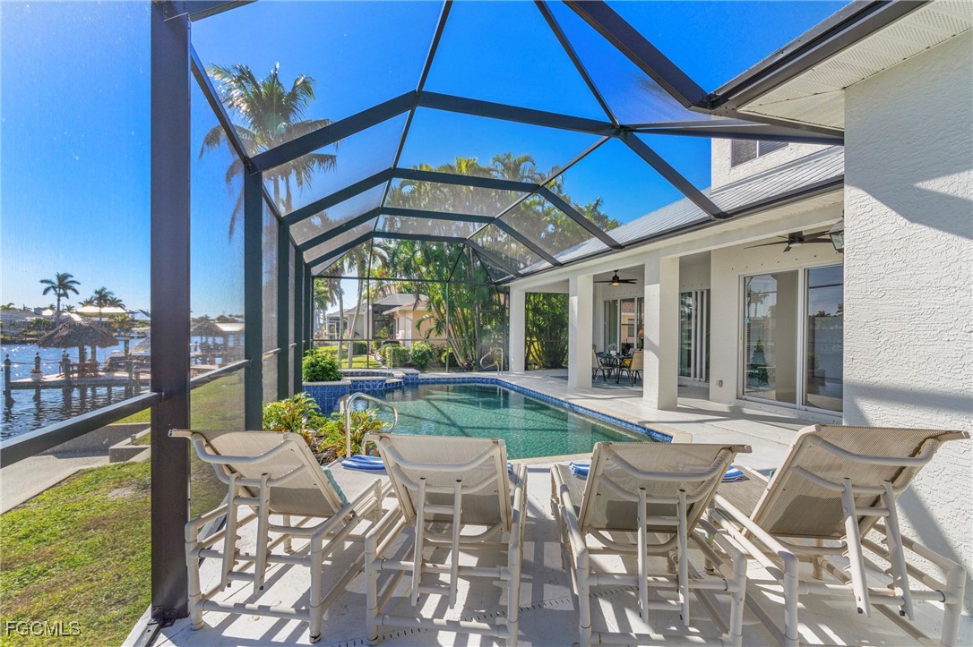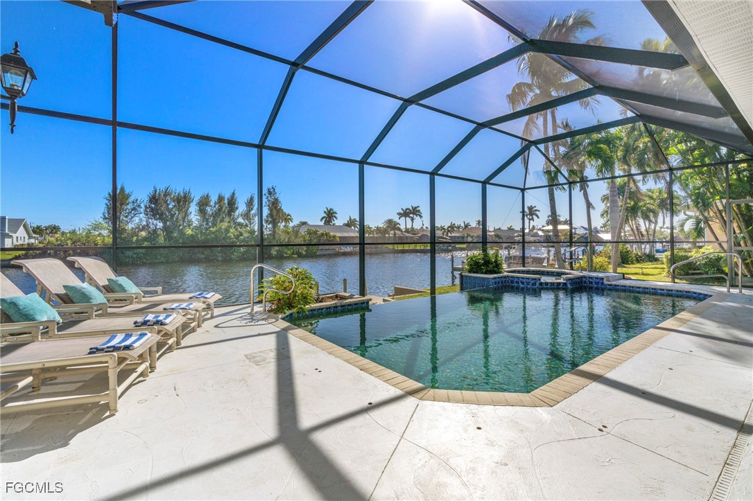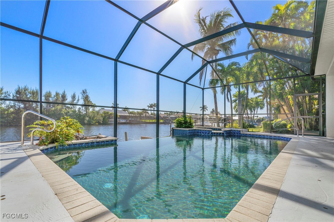 TURNKEY! This super spacious 4 bedroom+den/3.5 bathroom villa is located in beautiful SW Cape Coral off of El Dorado Pkwy. The lot is located right on the Merrick Canal, which is one of the widest canals in the Cape. You'll enjoy gorgeous views of the infinity pool, the spa, and the beautiful canal. You’re only 5 minutes away from enjoying Cape Harbour Marina, with all the restaurants, bars, shops, and the beautiful luxurious boats in the marina. 2 primary en-suite bedrooms. NEW ROOF 2023. Was NOT flooded during Ian.