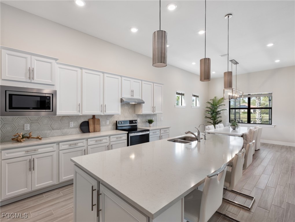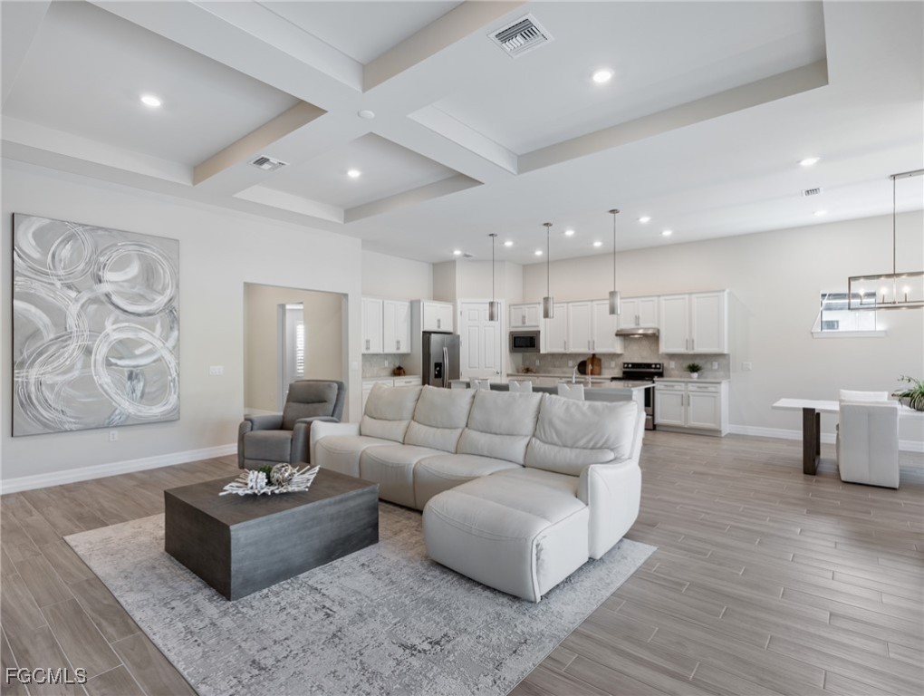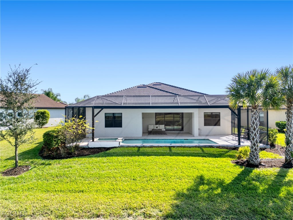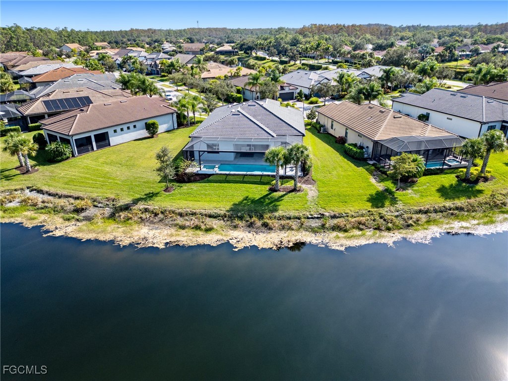 Introducing one of Bridgetown’s most coveted waterfront properties - this exceptional lot combines ultimate privacy with breathtaking, long-range water views. Rarely on the market, the Pulte “Pinnacle Model” boasts nearly 2,500 square feet of refined living space, featuring three bedrooms + den, three bathrooms, pool & spa, and a spacious three-car garage. Step inside to be greeted by soaring 14-foot coffered ceilings and a stunning waterfront view! Elegant tile flooring flows throughout the main living areas of the home, and plush carpeting are in the bedrooms for added comfort. The gourmet kitchen—truly the heart of the home—invites family gatherings and memorable meals with its large center island, quartz countertops, designer lighting, custom backsplash, and advanced reverse osmosis water treatment system. When its time to retreat for the evening, the split bedroom design ensures privacy for both owners and guests.The expansive primary suite includes a mini-split AC unit for personalized climate control, a generous walk-in closet, dual sinks, and a massive shower for a spa-like experience. Two additional guest bedrooms offer versatile accommodations; one is highlighted by impressive bay windows and plantation shutters, providing natural light and serene views. Outside, enjoy spectacular sunsets from the expansive entertaining areas, where the integrated pool and spa create an ideal backdrop for relaxing or hosting friends. Additional premium features include a large picture screen lanai cage, sea-shell coated outdoor tiles, and an epoxy-coated garage floor for durability and style. This turn-key home is thoughtfully sold furnished, allowing you to move in and immediately enjoy the luxurious waterfront lifestyle this home has to offer. Just minutes from the home by golf cart or car is the stellar amenity center. Tennis, pickleball, bocce ball, fitness classes, gym workouts, lap swimming or simply relaxing by the pool all happen here! You are now HOME!