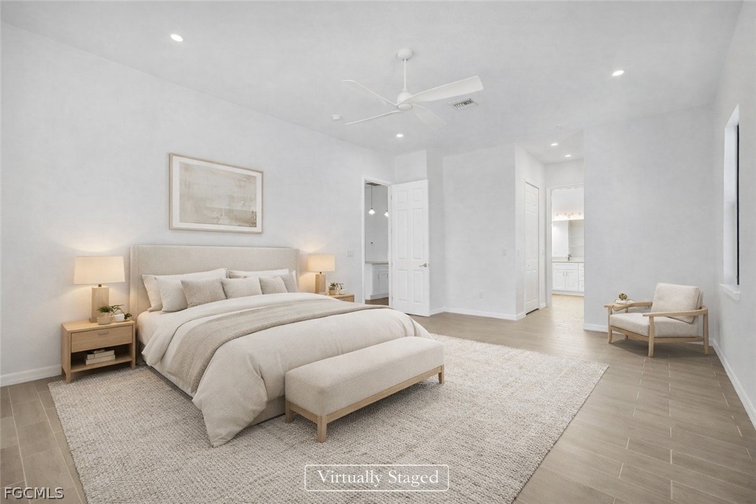 The spacious primary suite includes sliding glass doors to the lanai, two walk-in closets, and a spa-inspired bath with dual vanities, soaking tub, and walk-in shower. All guest bedrooms are generously sized as well.
