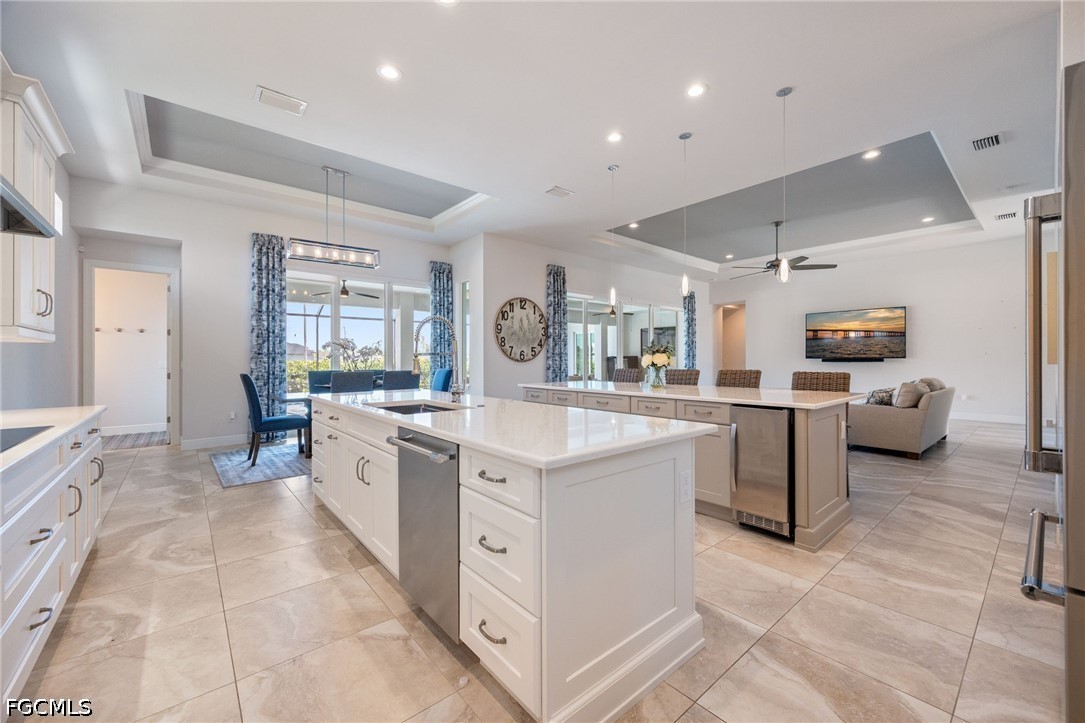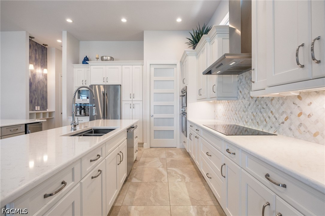 The Kitchen is a true Showpiece, designed for both everyday living and entertaining, featuring Dual Islands, Quartz Countertops, Custom Wood Cabinetry, Premium Stainless Steel Appliances with Double Wall Ovens, a Built-In Coffee Bar, a separate Wine Cooler, and an Expansive Walk-In Pantry with Custom Shelving and Direct Exterior Access. Just off the main living area, a dedicated Pool Bath with Designer Tile and custom finishes adds both convenience and functionality for indoor-outdoor living.