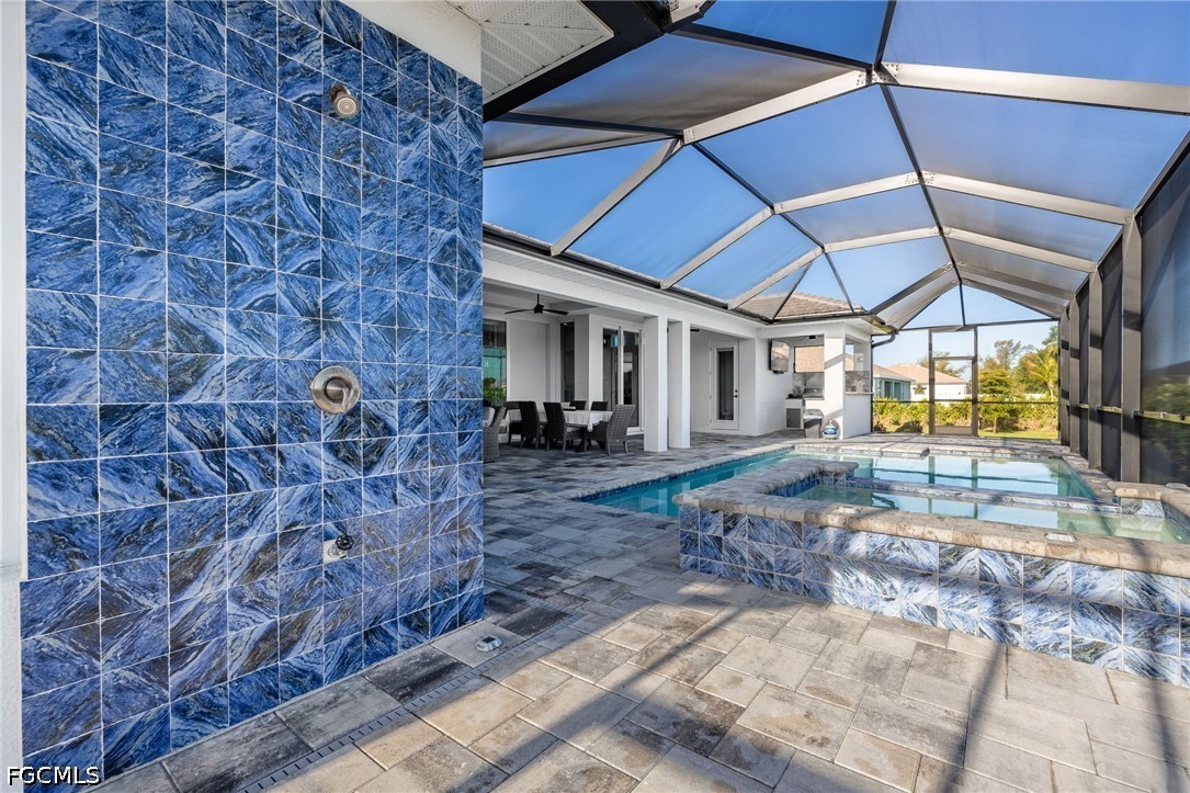 Outdoor Living is a true highlight, featuring an Extended Under-Truss Lanai with Built-In Lighting and multiple entertaining areas centered around a stunning Salt Water Pool and Spa with Sun Shelf, Water Features, Outdoor Kitchen, and additional Paver Patio space. An Outdoor Tiled Shower, Storage Room, and side access walkway add convenience.