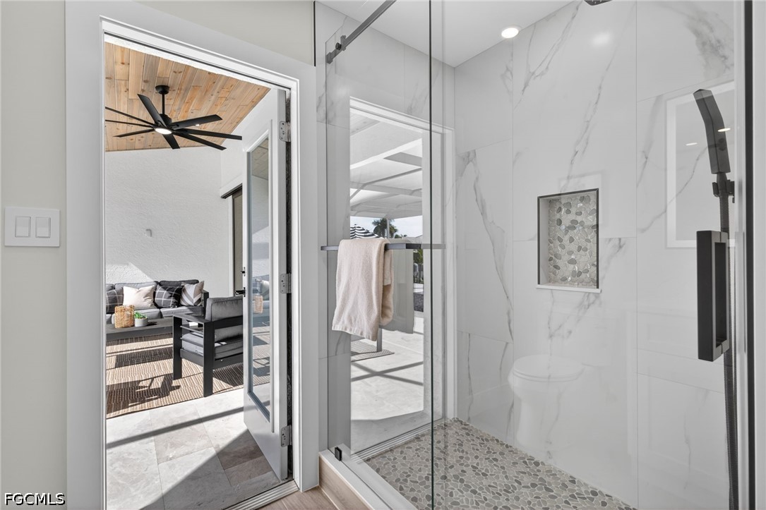 The true showstopper is the seamless indoor-outdoor living experience. Four stunning pocketing sliders fully open to the lanai, creating an expansive, airy flow that defines the Florida lifestyle. The lanai is enhanced by a picture window screen enclosure, offering unobstructed water views, along with a premium travertine pool deck and a beautifully finished tongue-and-groove, weatherproof stained wood ceiling, adding warmth and architectural detail to your outdoor living space.