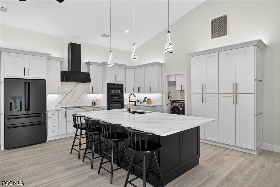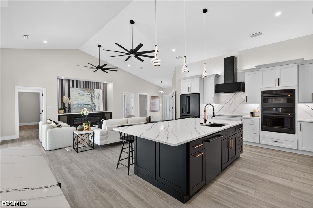 Inside, the home showcases high-end luxury finishes throughout, including a designer kitchen with black stainless GE Café appliances and premium quartz countertops, all flowing seamlessly into open-concept living spaces designed for both everyday living and effortless entertaining.