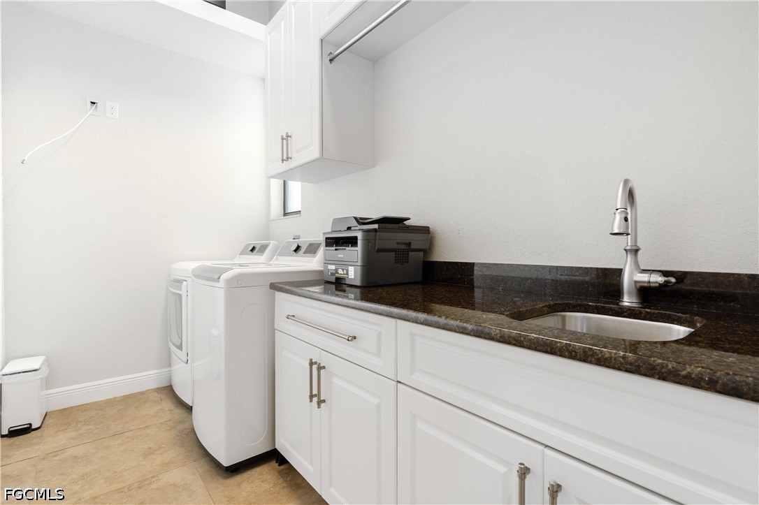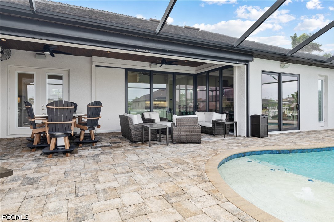 Outdoor living is exceptional, with a resort-style pool featuring a sun shelf and bar seating beneath a tiki bar, all framed by a full-length picture window screen enclosure. An outdoor kitchen and built-in granite dining table make entertaining effortless.