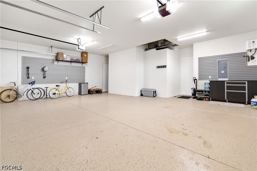 The three-car garage offers an epoxy floor, custom storage, cabinetry, and plumbing for an ice maker. Additional upgrades include a money-saving tankless water heater and a 2024 A/C unit still under warranty.