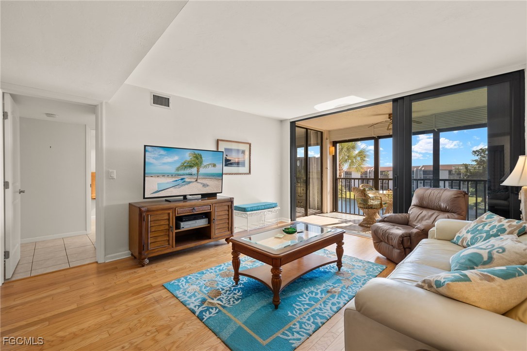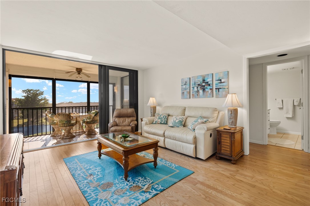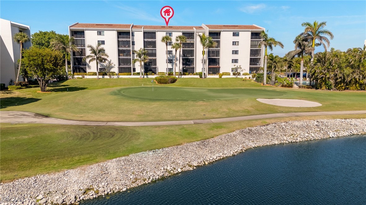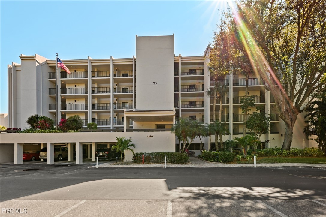 Stunning view of Golf Course, Lake, and Fountains from this 4th floor, THREE Bedroom, TWO Bath UPDATED condo. Updates include: Newly remodeled kitchen with Upscale "LEATHERIZED" GRANITE, designer backsplash, and NEW Stainless-Steel appliances. Hardwood Floors throughout living area. NEW Carpet recently installed in all three bedrooms. Primary and Guest Baths have lovely updates. HURRICANE sliders and windows! New air conditioning unit and hot water heater. MOVE-IN... TURN-KEY! Underground parking. The Landings Yacht Golf and Tennis Clubs is one of the most prestigious communities off McGregor. Enter through the guarded gate onto "lush "park-like" grounds. Amenities included in private membership: A boat-slip (up to 60') at the FULL-SERVICE MARINA located on the Caloosahatchee River. Also enjoy UNLIMITED Golf, Tennis, Pickle-Ball, and Bocce-Ball and fitness Center. Two restaurant's (one newly remodeled). Short drive to beaches, airport, entertainment and shopping.