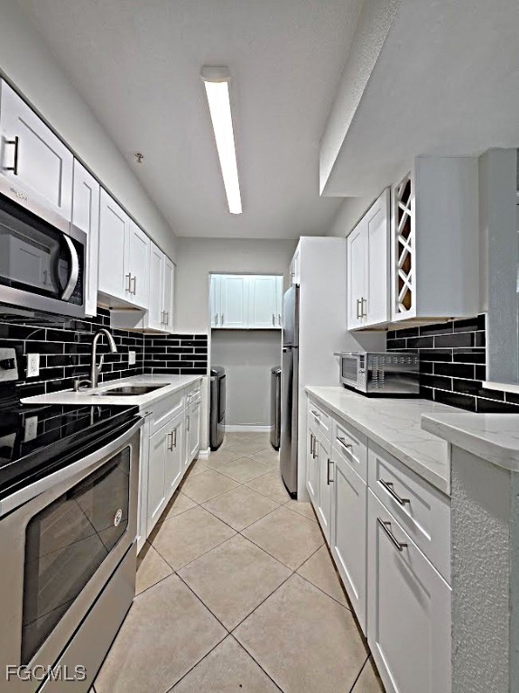 The heart of the home is a brand-new, designer kitchen. It features white shaker cabinetry, quartz countertops, and a sleek black subway tile backsplash. It comes fully equipped with modern stainless steel appliances, including an over-the-range microwave and a wine rack.