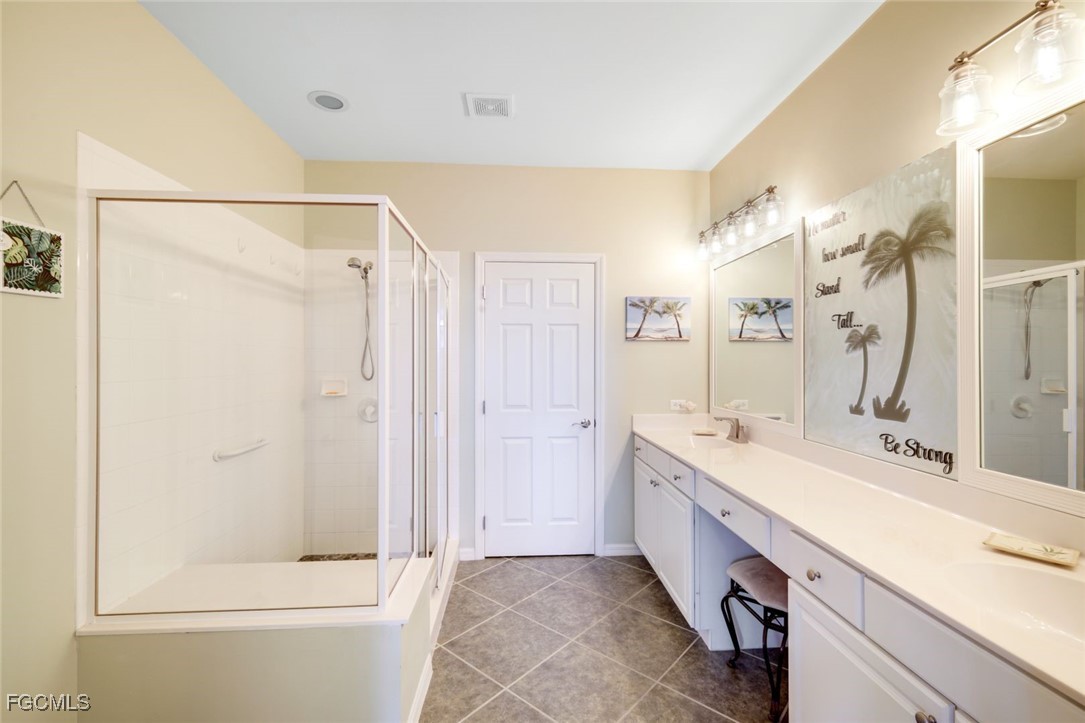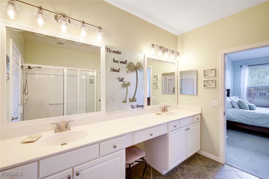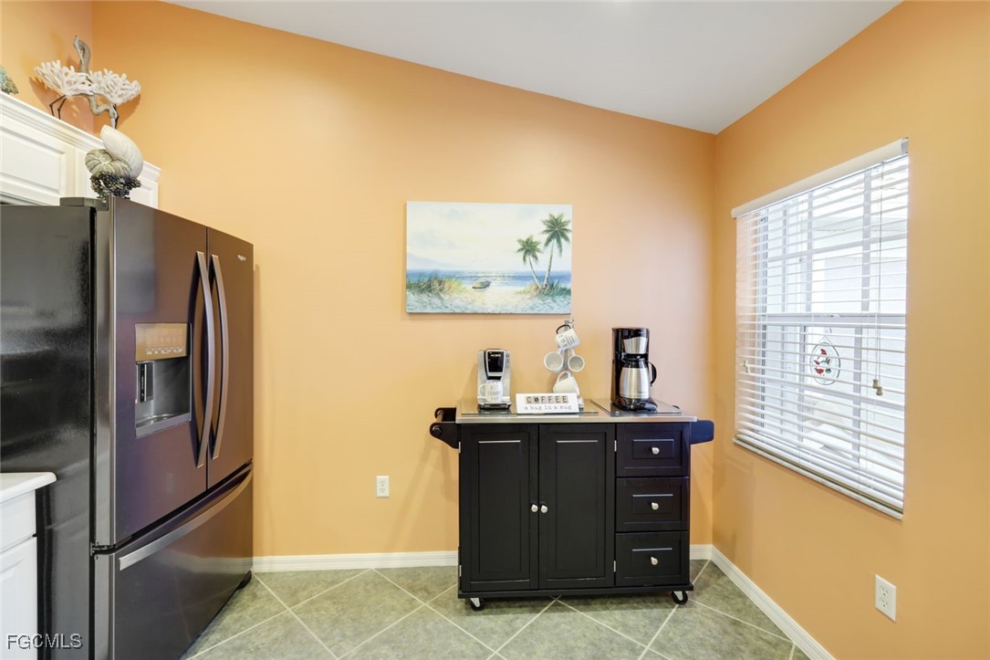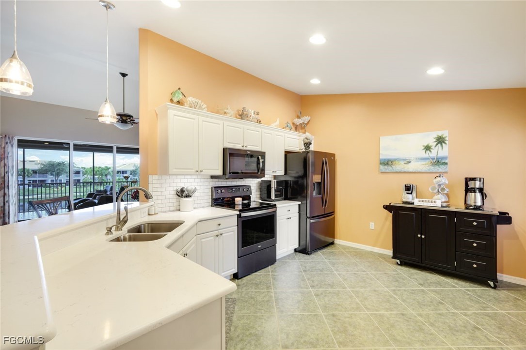 The spacious eat-in kitchen overlooks the dining area and is thoughtfully appointed with black stainless-steel appliances, quartz countertops, a breakfast bar, pendant lighting, subway tile backsplash, and pantry. A set of triple sliding glass doors opens to the southeast-facing lanai with tiled floors—ideal for morning coffee or evening unwinding while enjoying peaceful water views. Sunshades on the lanai and accordion shutters on the windows add comfort and protection.