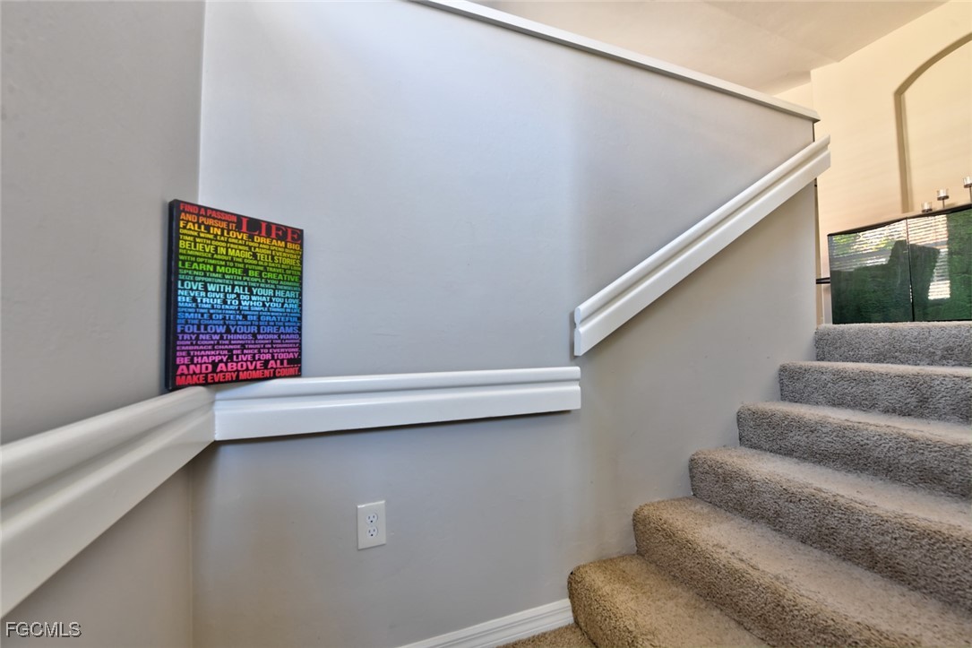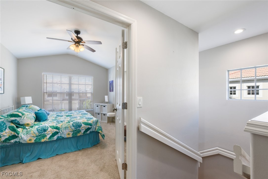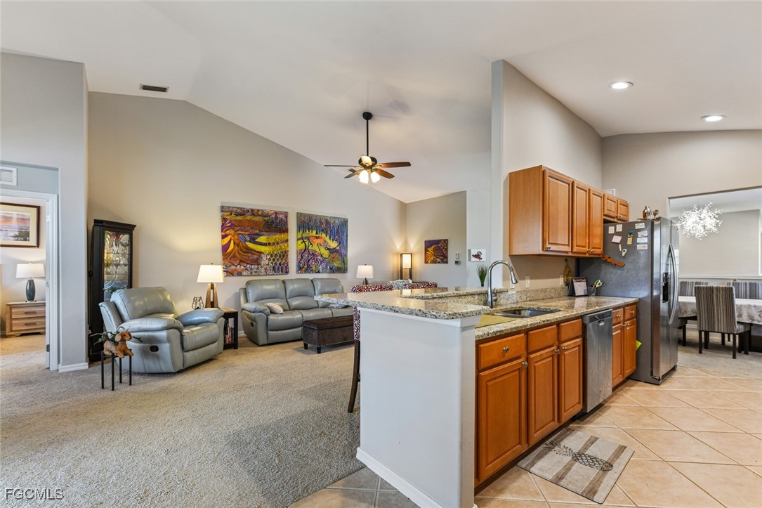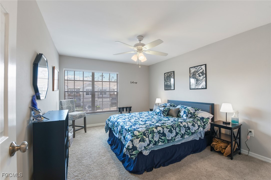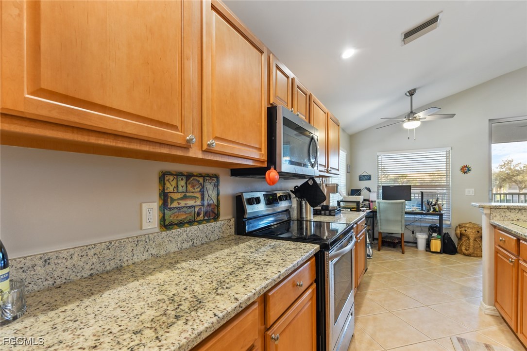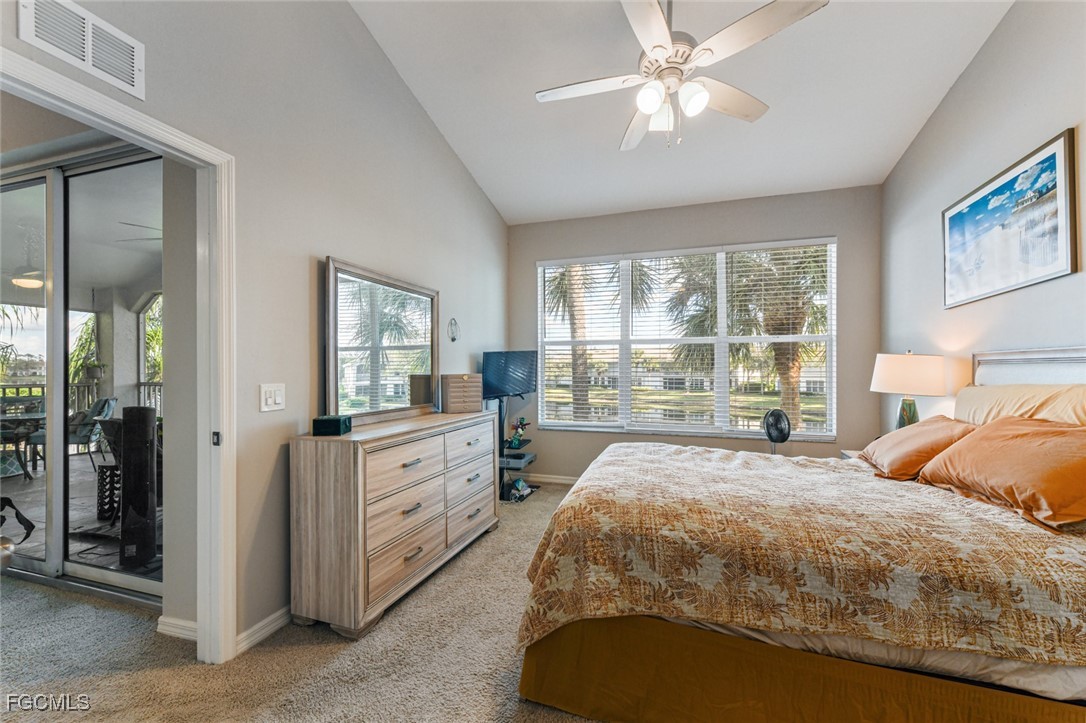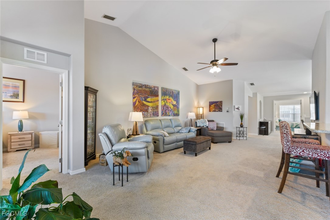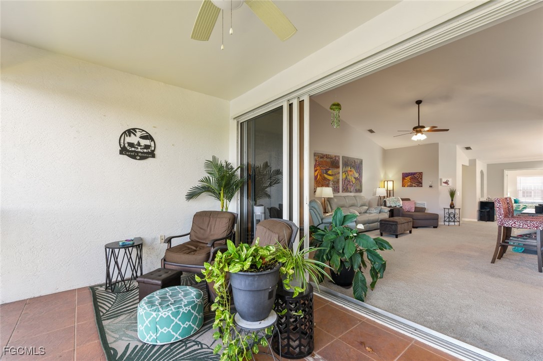 Location, location, location! With a lakeside view and southeast orientation this highly desirable Spoonbill (end unit) is just the place to call home! Enjoy sunrise and coffee on the rescreened (noseeum screen) large, tiled lanai. Relax in the evening with a full moon glistening on the water. The light and airy feel is from vaulted ceilings over the open concept great room and an updated kitchen with granite countertops and stainless appliances. Split bedroom floorplan; carpet and tile throughout. Master suite bathroom with dual sinks, a walk-in shower and a large walk-in closet. French doors on the den that owner has set as a bedroom. This home is not turnkey so you'll start with a fresh palette to design your new home. Building has a new roof; 1 car garage w/opener and private driveway. Colonial Country Club is an active community: 8 pickleball courts; 8 clay tennis courts; bocce, attended fitness center with classes, a resort style pool, clubhouse/bar/restaurant and an activities calendar with numerous social events. Property is not bundled golf but there is access to the newly renovated Gordon Lewis golf course. The neighborhood pool is steps away and access to the 3 mile nature trail is across the street. Wildlife abounds in the preserve with paved trails and boardwalk. Conveniently located to RSW and the interstate highway Make your move now and enjoy the vibrant winter season at Colonial!